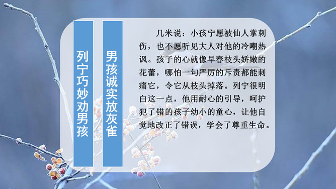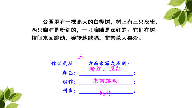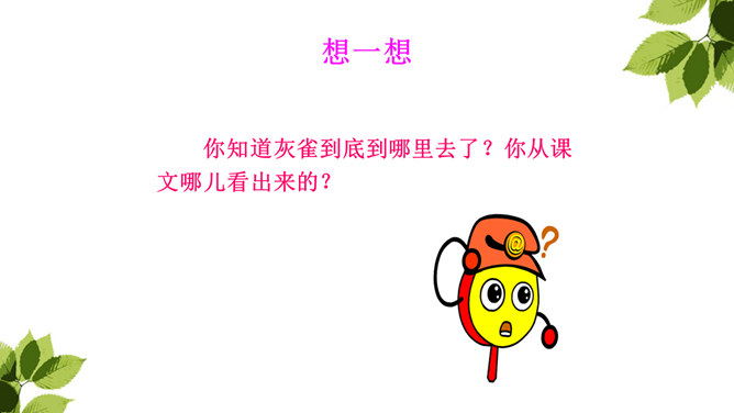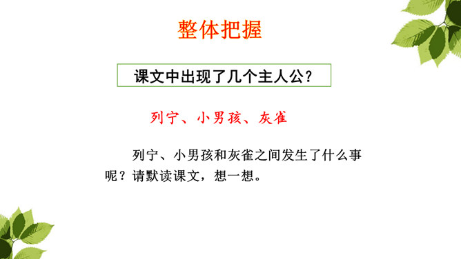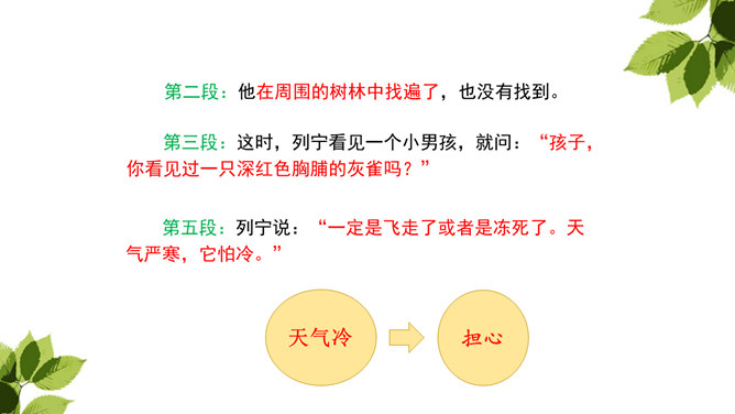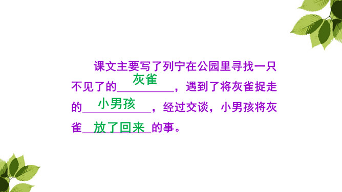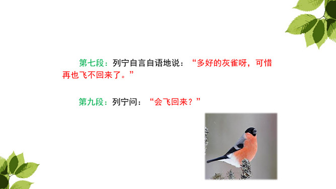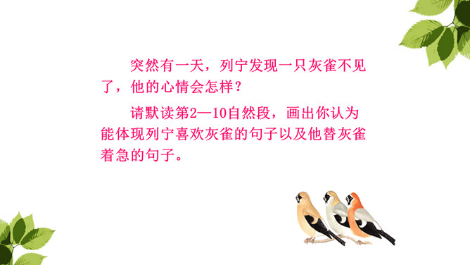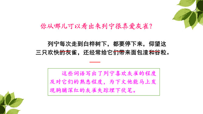 你从哪儿可以看出来列宁很喜爱灰雀?这些词语写出了列宁喜欢灰雀的程度及对它们的熟悉程度,为下文他能马上发现胸脯深红的灰雀失踪埋下伏笔。突然有一天,列宁发现一只灰雀不见了,他的心情会怎样?请默读第2—10自然段,画出你认为能体现列宁喜欢灰雀的句子以及他替灰雀着急的句子。你知道灰雀到底到哪里去了?你从课文哪儿看出来的?不仅可以知道灰雀是小男孩捉的,还体会到小男孩放回灰雀的决心越来越大。所属专题:灰雀ppt。