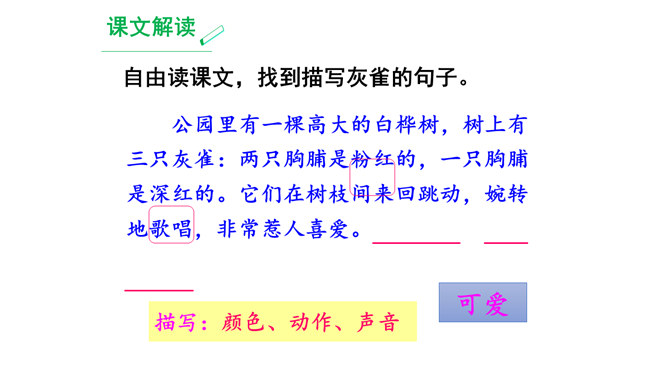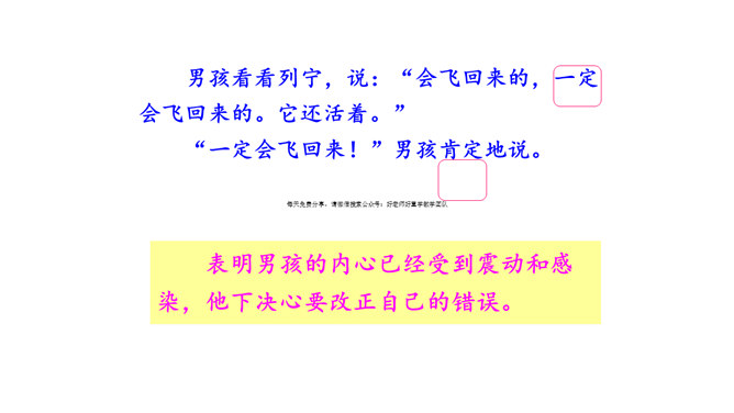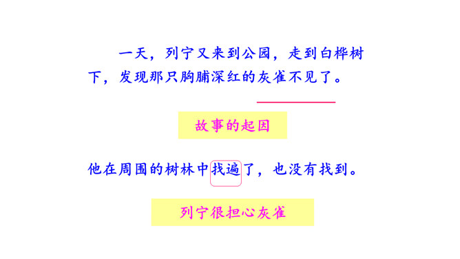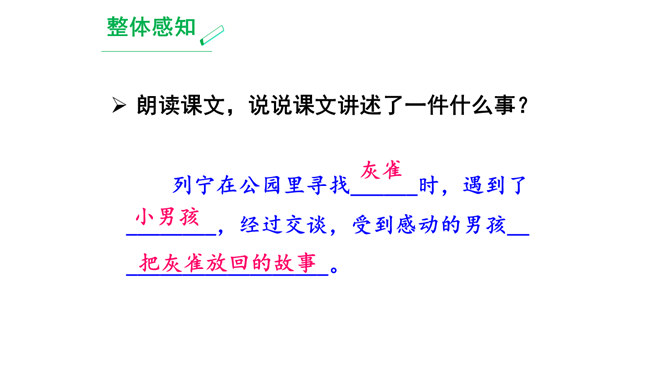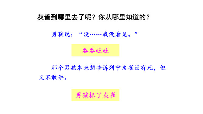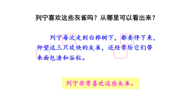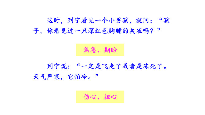 请大家读列宁寻找灰雀的几句话,想想要用什么语气读,仔细体会列宁这些话的意思。列宁的话一方面体现了对灰雀的担心和惋惜,另一方面是用自己的情绪感染男孩,引导他认识错误。这体现了列宁的善解人意、循循善诱及对男孩的尊重与爱护。思考:列宁为什么不问男孩,却问灰雀?一方面表现出列宁见到灰雀的惊喜,另一方面也表现了列宁对男孩的尊重与爱护。后来列宁、男孩和灰雀之间又发生了什么事?发挥你的想象,把它写下来!所属专题:灰雀ppt。