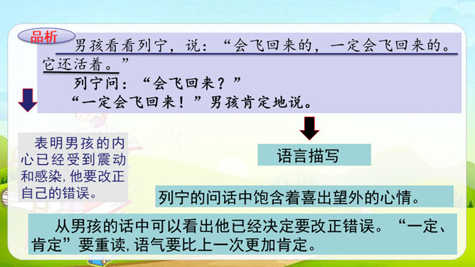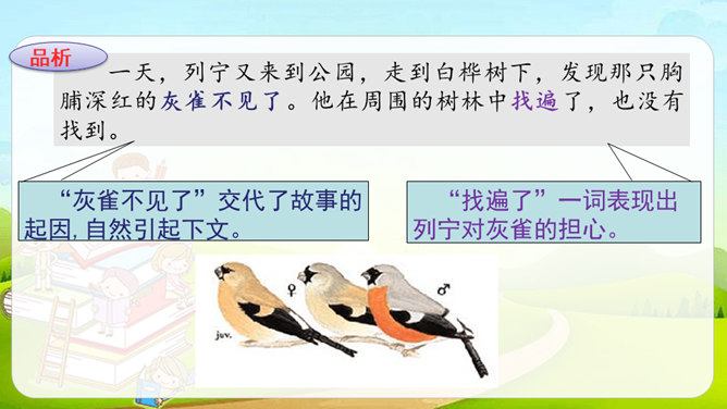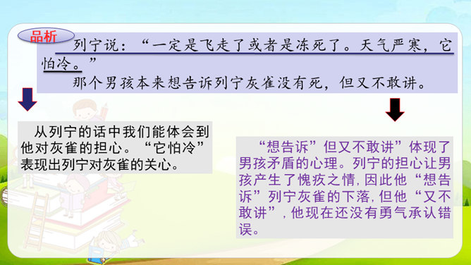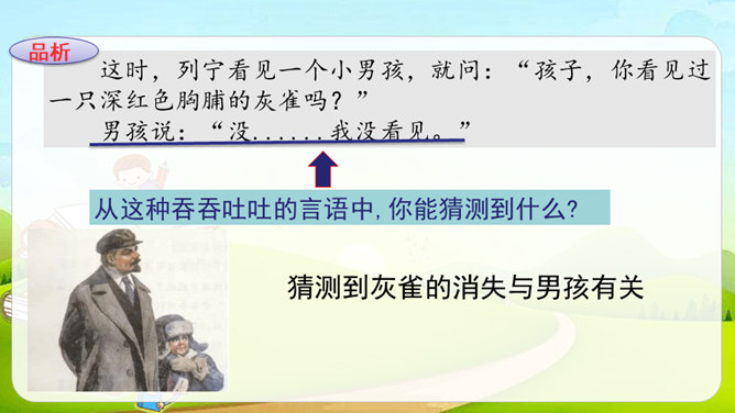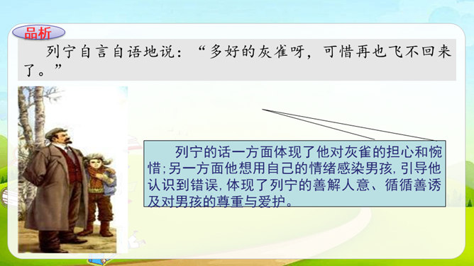 课文讲述列宁发现公园里灰雀的失踪与男孩有关,但他不直接批评,而是通过交谈让男孩意识到自已的错误,主动放鸟归园的故事。从列宁的话中我们能体会到他对灰雀的担心。“它怕冷”表现出列宁对灰雀的关心。“想告诉”但又不敢讲”体现了男孩矛盾的心理。列宁的担心让男孩产生了愧疚之情,因此他“想告诉”列宁灰雀的下落,但他“又不敢讲”,他现在还没有勇气承认错误。列宁的话一方面体现了他对灰雀的担心和惋惜;另一方面他想用自己的情绪感染男孩,引导他认识到错误,体现了列宁的善解人意、循循善诱及对男孩的尊重与爱护。所属专题:灰雀ppt。