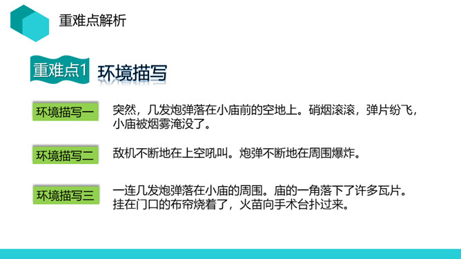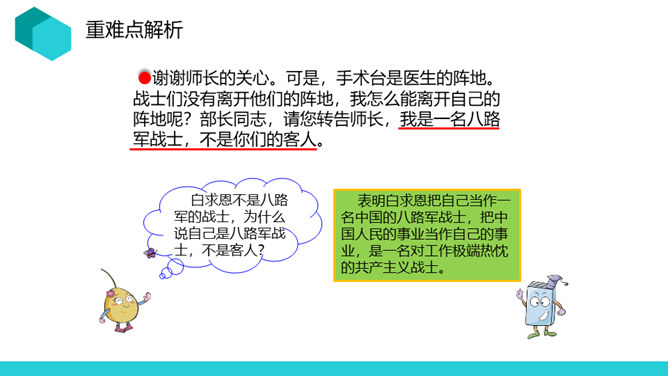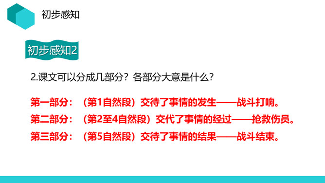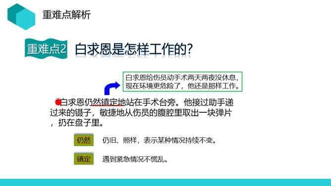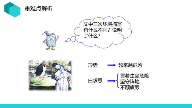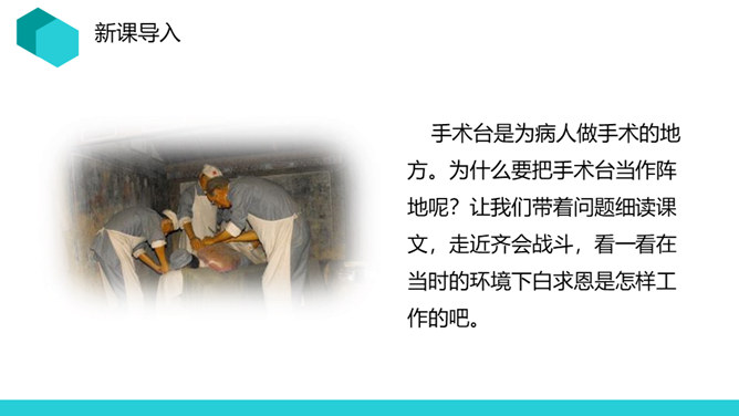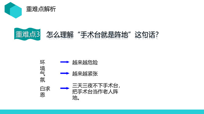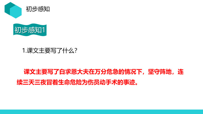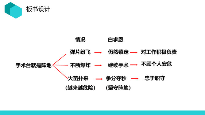 手术台是为病人做手术的地方。为什么要把手术台当作阵地呢?让我们带着问题细读课文,走近齐会战斗,看一看在当时的环境下白求恩是怎样工作的吧。课文主要写了白求恩大夫在万分危急的情况下,坚守阵地,连续三天三夜冒着生命危险为伤员动手术的事迹。课文可以分成几部分?各部分大意是什么?第一部分:(第1自然段)交待了事情的发生——战斗打响。第二部分:(第2至4自然段)交代了事情的经过——抢救伤员。第三部分:(第5自然段)交待了事情的结果——战斗结束。所属专题:手术台就是阵地ppt。
