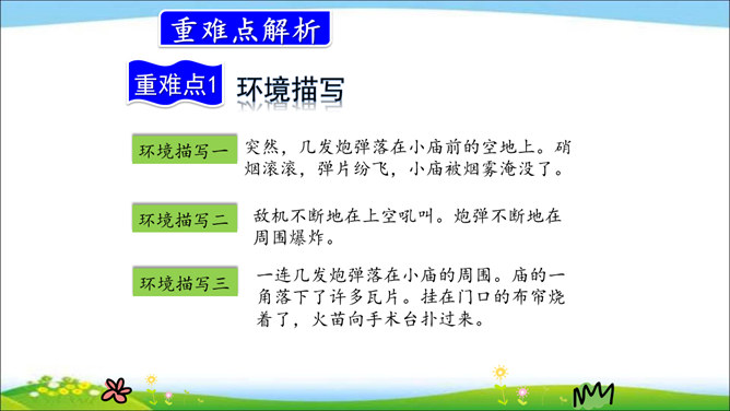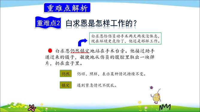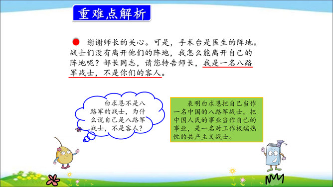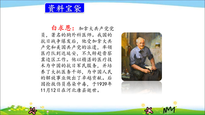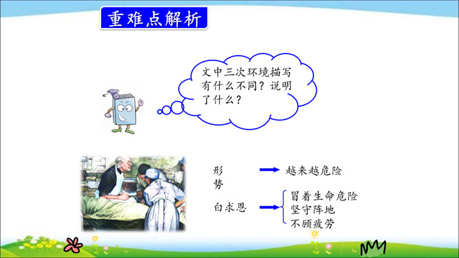 文中三次环境描写有什么不同?说明了什么?白求恩不是八路军的战士,为什么说自己是八路军战士,不是客人?表明白求恩把自己当作一名中国的八路军战士,把中国人民的事业当作自己的事业,是一名对工作极端热忱的共产主义战士。说明白求恩一心只想着加快手术的速度,尽可能地在短时间里抢救更多的伤员。体现了他把伤员看得比自己更重要,突出了白求恩坚守阵地的精神。说明了白求恩对自己的工作极端负责任的优秀品质。所属专题:手术台就是阵地ppt。