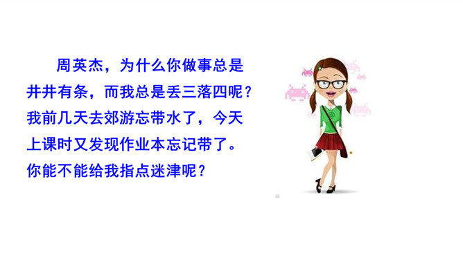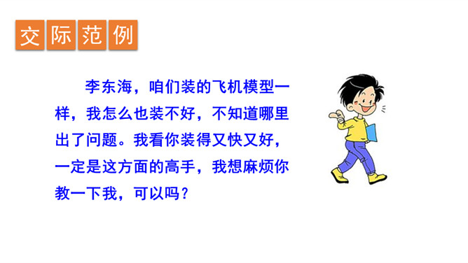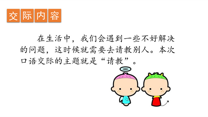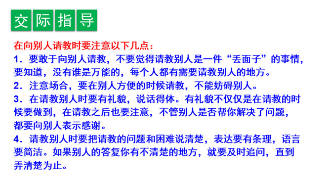 在向别人请教时要注意以下几点:1.要敢于向别人请教,不要觉得请教别人是一件“丢面子”的事情,要知道,没有谁是万能的,每个人都有需要请教别人的地方。2.注意场合,要在别人方便的时候请教,不能妨碍别人。3.在请教别人时要有礼貌,说话得体。有礼貌不仅仅是在请教的时候要做到,在请教之后也要注意,不管别人是否帮你解决了问题,都要向别人表示感谢。4.请教别人时要把请教的问题和困难说清楚,表达要有条理,语言要简洁。所属专题:请教ppt。