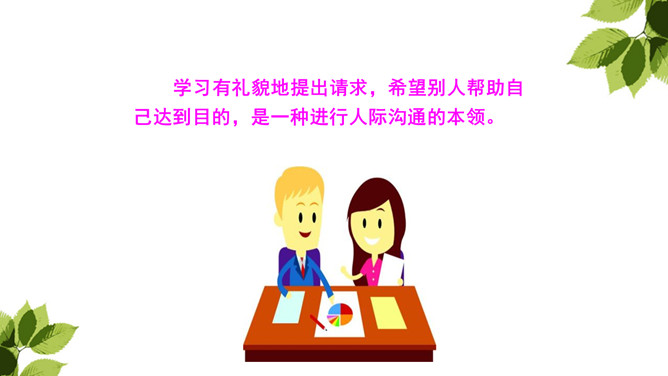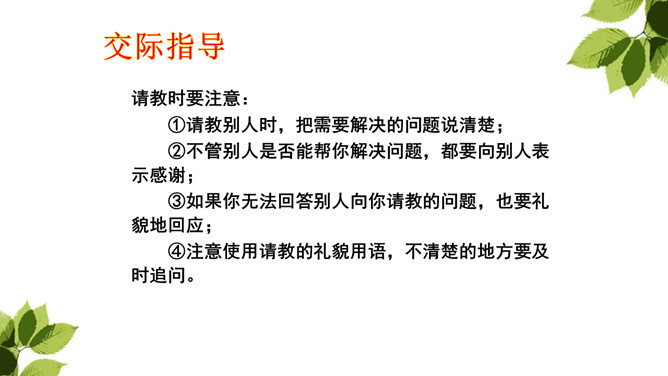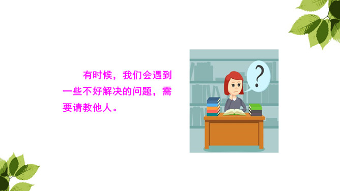 请教时要注意:①请教别人时,把需要解决的问题说清楚;②不管别人是否能帮你解决问题,都要向别人表示感谢;③如果你无法回答别人向你请教的问题,也要礼貌地回应;④注意使用请教的礼貌用语,不清楚的地方要及时追问。有时候,我们会遇到一些不好解决的问题,需要请教他人。学习有礼貌地提出请求,希望别人帮助自己达到目的,是一种进行人际沟通的本领。所属专题:请教ppt。