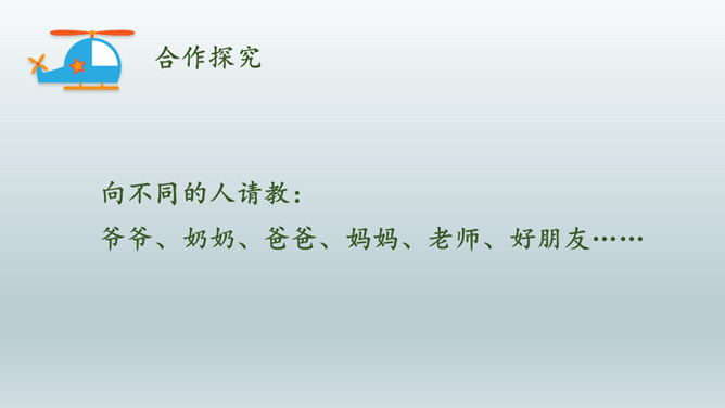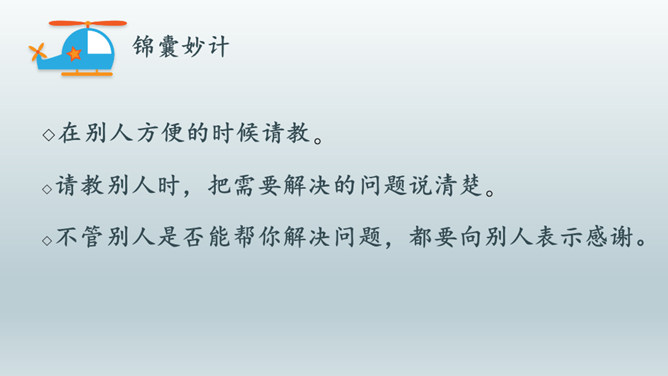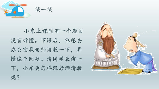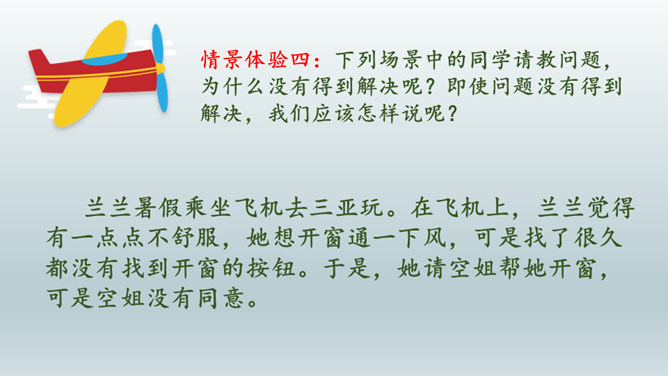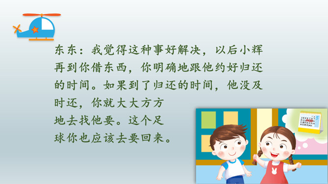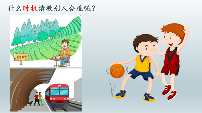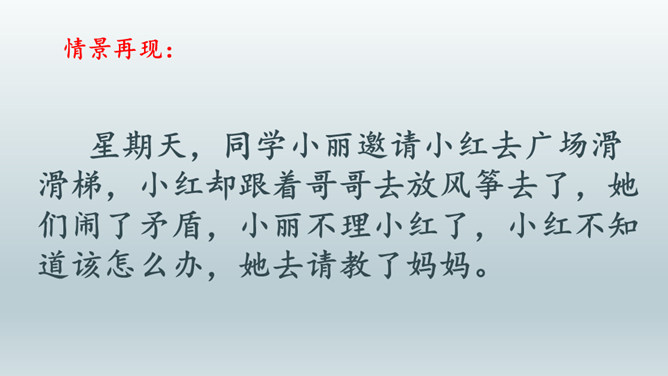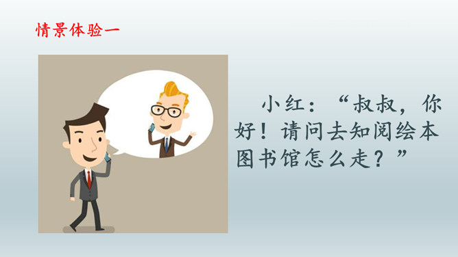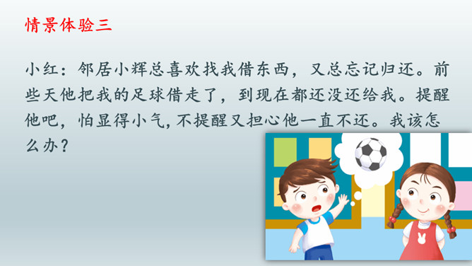 情景体验一:小红:“叔叔,你好!请问去知阅绘本图书馆怎么走?”情景再现:星期天,同学小丽邀请小红去广场滑滑梯,小红却跟着哥哥去放风筝去了,她们闹了矛盾,小丽不理小红了,小红不知道该怎么办,她去请教了妈妈。情景体验三:小红:邻居小辉总喜欢找我借东西,又总忘记归还。前些天他把我的足球借走了,到现在都还没还给我。提醒他吧,怕显得小气,不提醒又担心他一直不还。我该怎么办?所属专题:请教ppt。