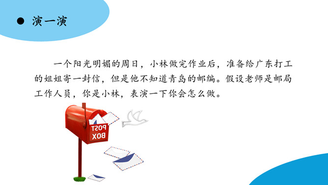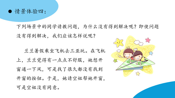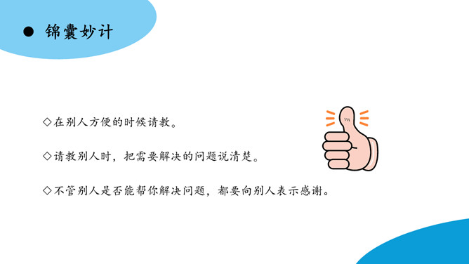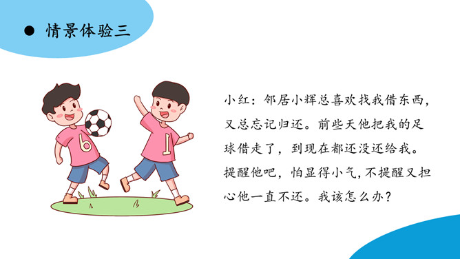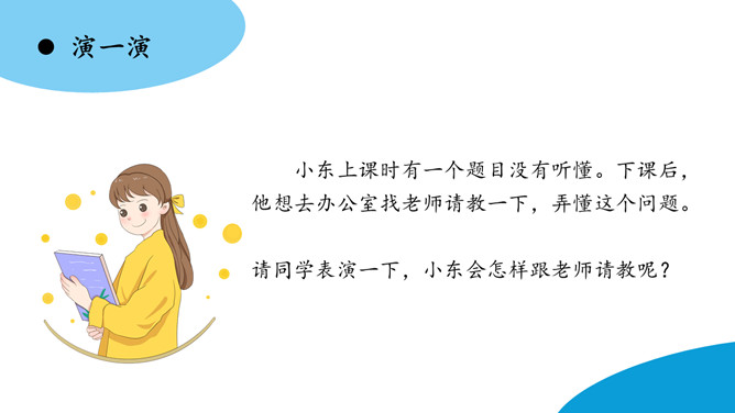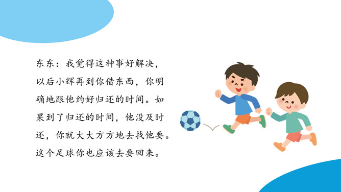 东东:我觉得这种事好解决,以后小辉再到你借东西,你明确地跟他约好归还的时间。如果到了归还的时间,他没及时还,你就大大方方地去找他要。这个足球你也应该去要回来。下列场景中的同学请教问题,为什么没有得到解决呢?即使问题没有得到解决,我们应该怎样说呢?小东上课时有一个题目没有听懂。下课后,他想去办公室找老师请教一下,弄懂这个问题。请同学表演一下,小东会怎样跟老师请教呢?所属专题:请教ppt。