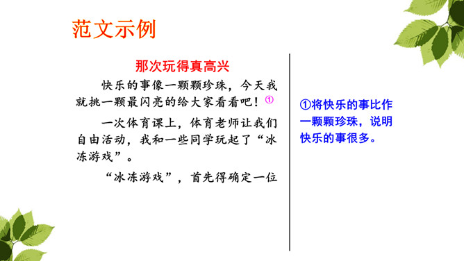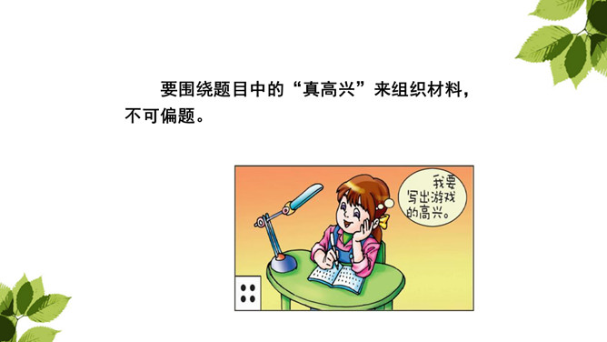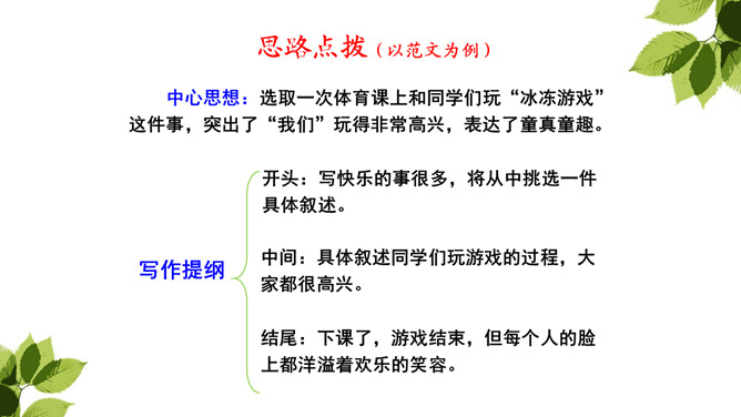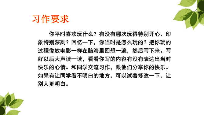 你平时喜欢玩什么?有没有哪次玩得特别开心、印象特别深刻?回忆一下,你当时是怎么玩的?把你玩的过程像放电影一样在脑海里回想一遍,然后写下来。写好以后大声读一读,看看你写的内容有没有表达出当时快乐的心情。和同学交流习作,跟他们分享你的快乐。如果有让同学看不明白的地方,可以试着修改一下,让别人更明白。选取典型事例,这件事要有头有尾,结构完整。写时要按一定的顺序写,如事情发展的顺序、倒叙等。所属专题:那次玩的真高兴ppt。