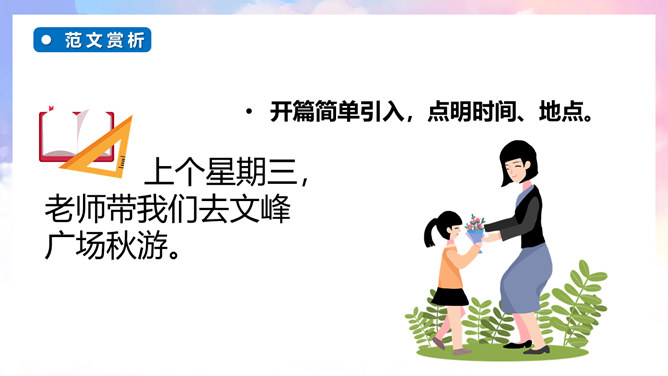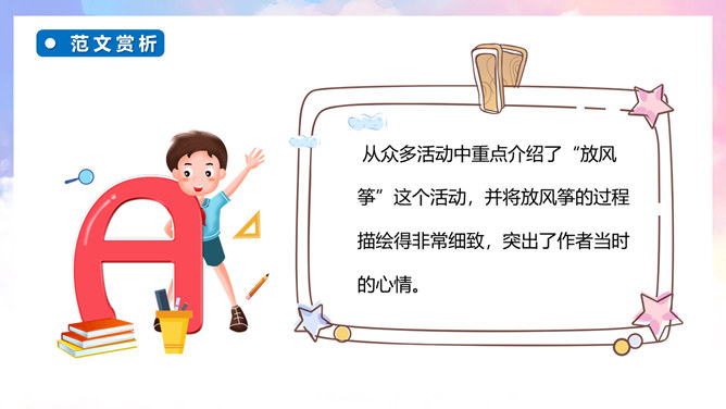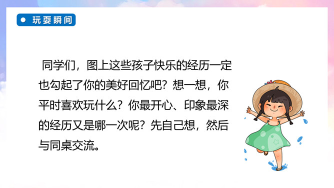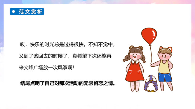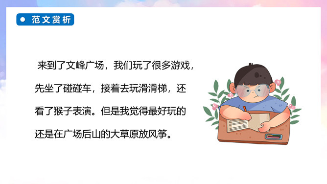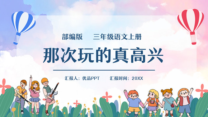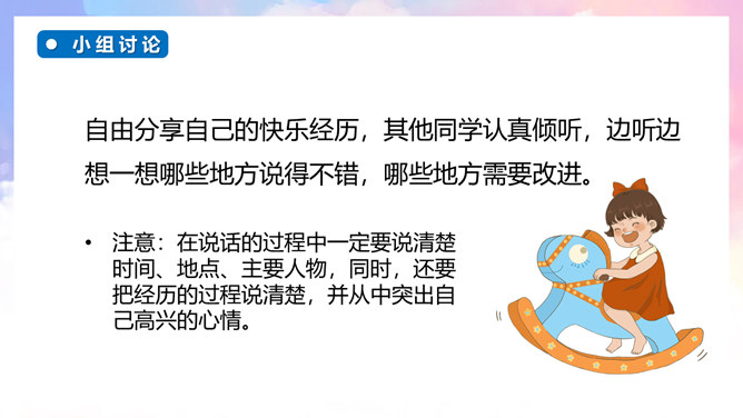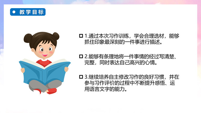 继续培养自主修改习作的良好习惯,并在参与习作评价的过程中不断提升感悟、运用语言文字的能力。能够有条理地将一件事情的经过写清楚、完整,同时表达自己高兴的心情。通过本次习作训练,学会合理选材,能够抓住印象最深刻的一件事进行描述。自由分享自己的快乐经历,其他同学认真倾听,边听边想一想哪些地方说得不错,哪些地方需要改进。注意:在说话的过程中一定要说清楚时间、地点、主要人物,同时,还要把经历的过程说清楚,并从中突出自己高兴的心情。所属专题:那次玩的真高兴ppt。