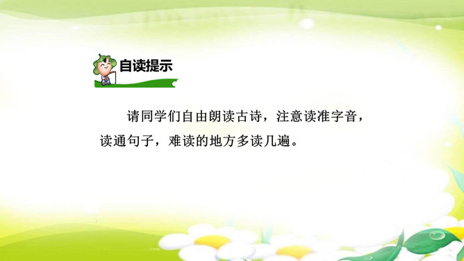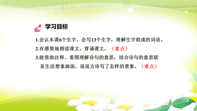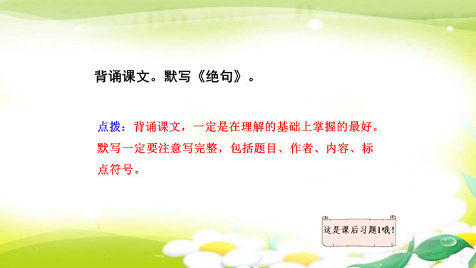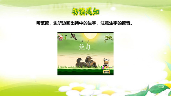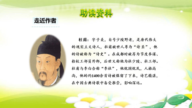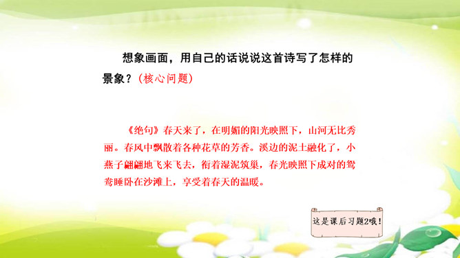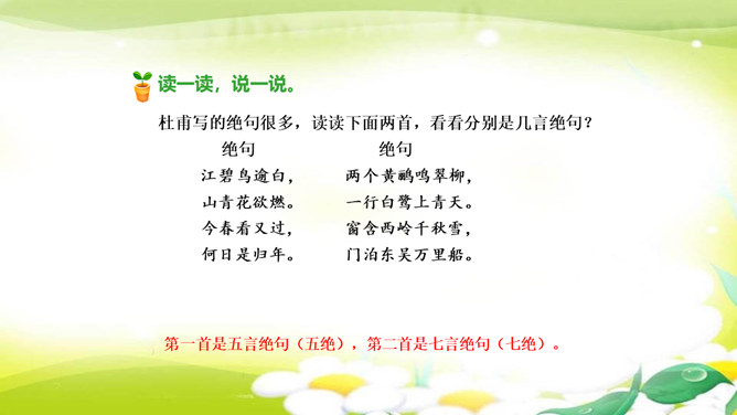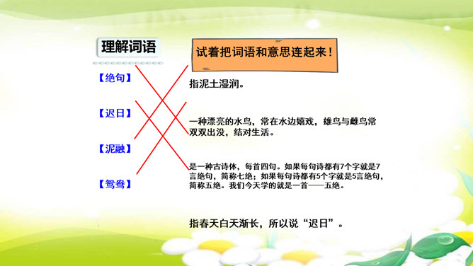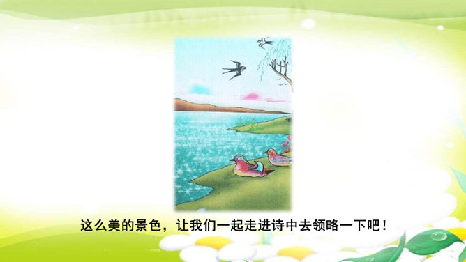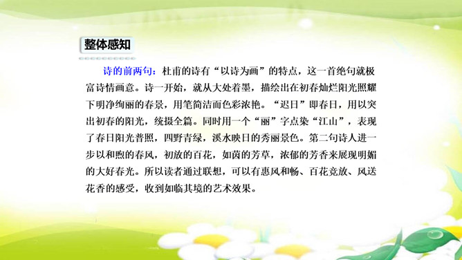 诗的前两句:杜甫的诗有“以诗为画”的特点,这一首绝句就极富诗情画意。诗一开始,就从大处着墨,描绘出在初春灿烂阳光照耀下明净绚丽的春景,用笔简洁而色彩浓艳。“迟日”即春日,用以突出初春的阳光,统摄全篇。同时用一个“丽”字点染“江山”,表现了春日阳光普照,四野青绿,溪水映日的秀丽景色。第二句诗人进一步以和煦的春风,初放的百花,如茵的芳草,浓郁的芳香来展现明媚的大好春光。所以读者通过联想,可以有惠风和畅、百花竞放、风送花香的感受,收到如临其境的艺术效果。