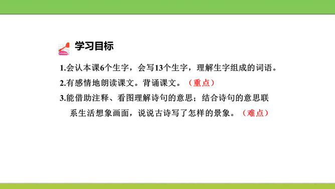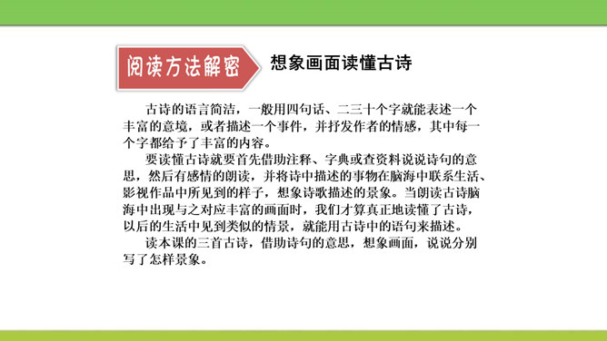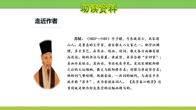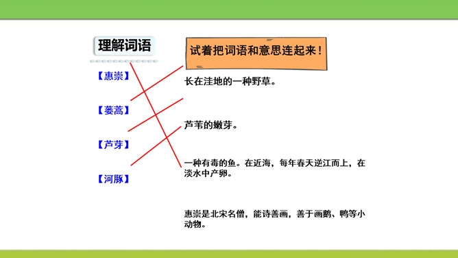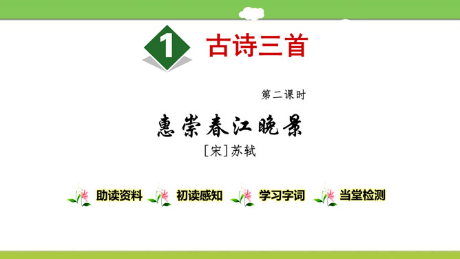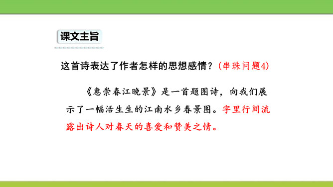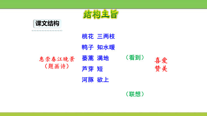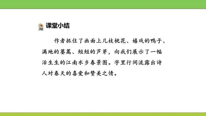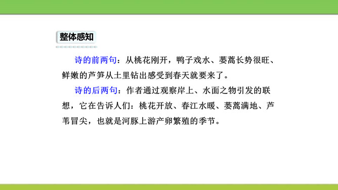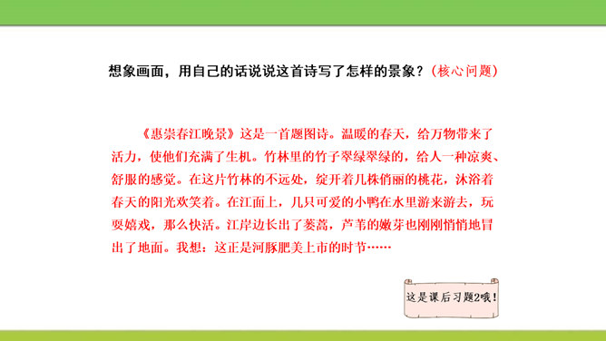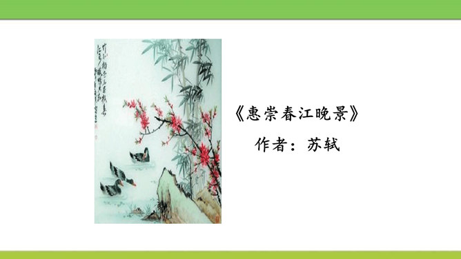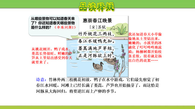 想象画面,用自己的话说说这首诗写了怎样的景象?这是一首题图诗。温暖的春天,给万物带来了活力,使他们充满了生机。竹林里的竹子翠绿翠绿的,给人一种凉爽、舒服的感觉。在这片竹林的不远处,绽开着几株俏丽的桃花,沐浴着春天的阳光欢笑着。在江面上,几只可爱的小鸭在水里游来游去,玩耍嬉戏,那么快活。江岸边长出了蒌蒿,芦苇的嫩芽也刚刚悄悄地冒出了地面。我想:这正是河豚肥美上市的时节……所属专题:惠崇春江晚景ppt。