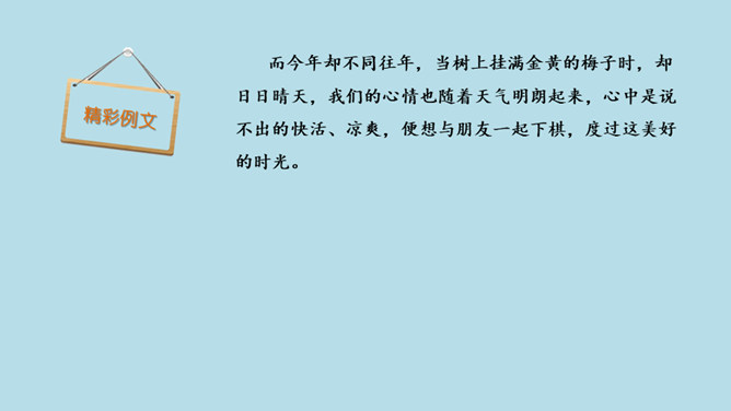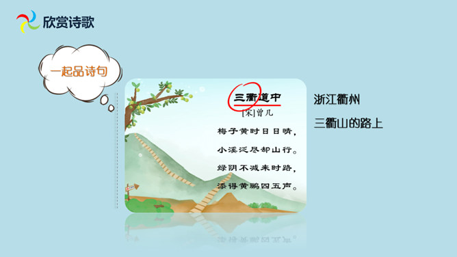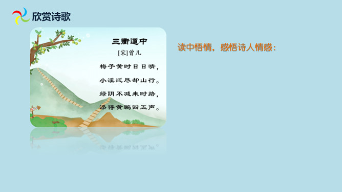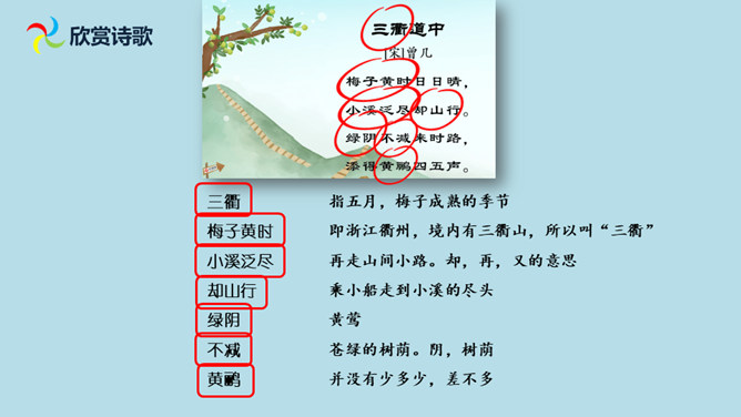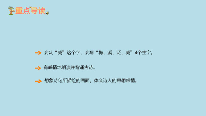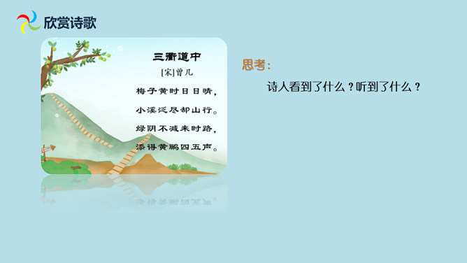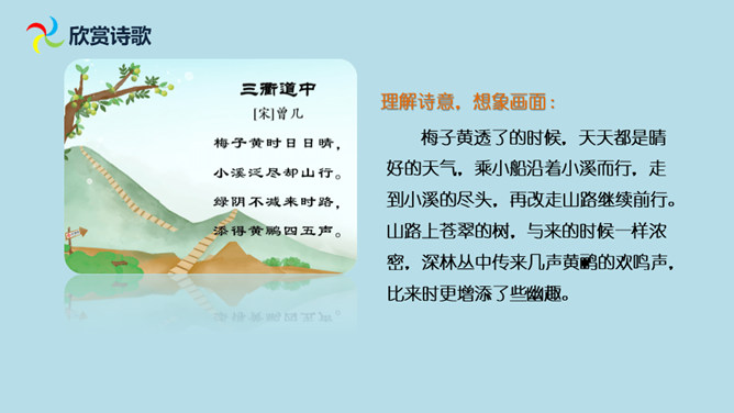 想象诗句所描绘的画面,体会诗人的思想感情。有感情地朗读并背诵古诗。会认“减”这个字,会写“梅、溪、泛、减”4个生字。理解诗意,想象画面:梅子黄透了的时候,天天都是晴好的天气,乘小船沿着小溪而行,走到小溪的尽头,再改走山路继续前行。山路上苍翠的树,与来的时候一样浓密,深林丛中传来几声黄鹂的欢鸣声,比来时更增添了些幽趣。在通常情况下,梅子成熟的时候大多是阴雨连绵的,那时,我们的生活十分不便。所属专题:三衢道中ppt。