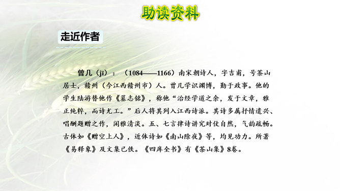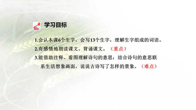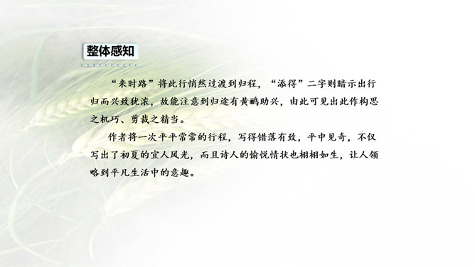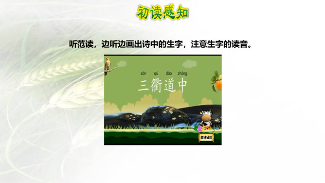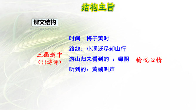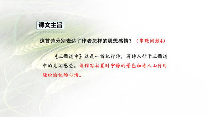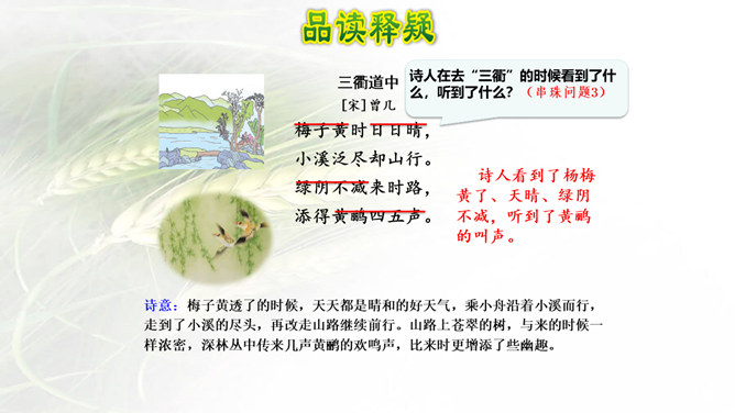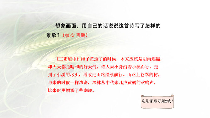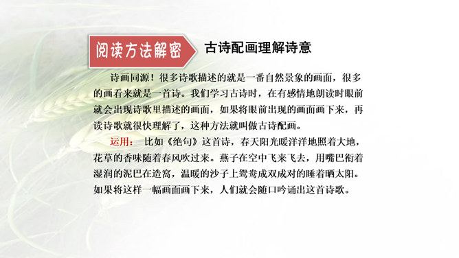 诗画同源!很多诗歌描述的就是一番自然景象的画面,很多的画看来就是一首诗。我们学习古诗时,在有感情地朗读时眼前就会出现诗歌里描述的画面,如果将眼前出现的画面画下来,再读诗歌就很快理解了,这种方法就叫做古诗配画。运用: 比如《绝句》这首诗,春天阳光暖洋洋地照着大地,花草的香味随着春风吹过来。燕子在空中飞来飞去,用嘴巴衔着湿润的泥巴在造窩,温暖的沙子上鸳鸯成双成对的睡着晒太阳。所属专题:三衢道中ppt。