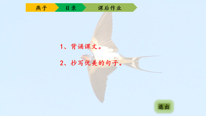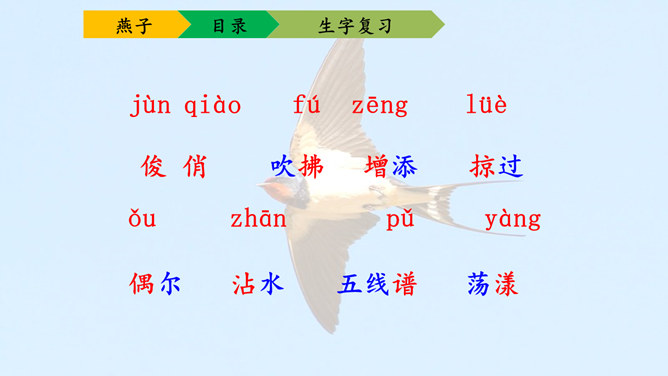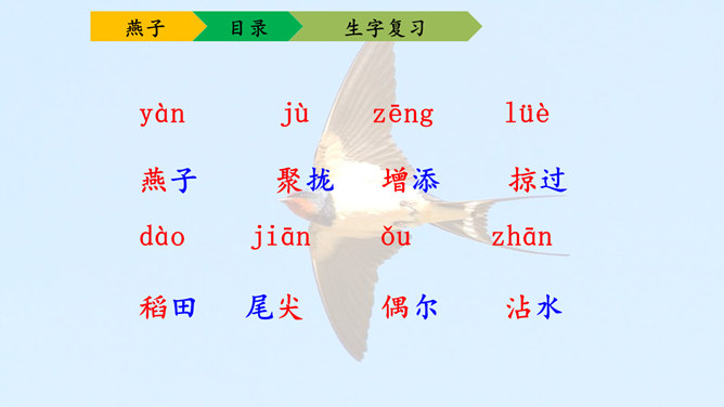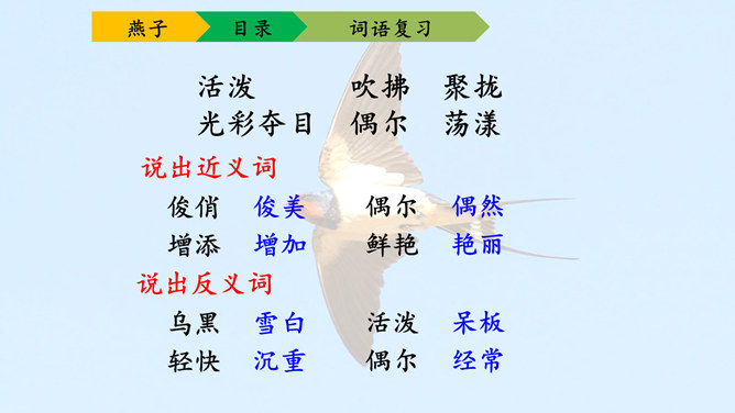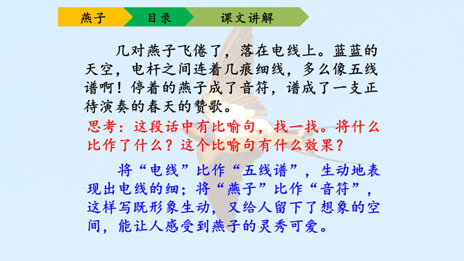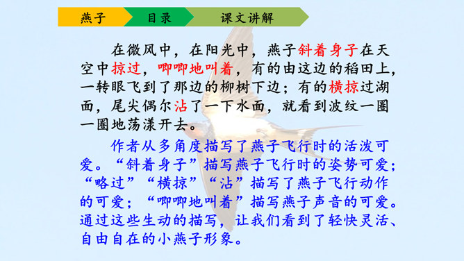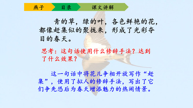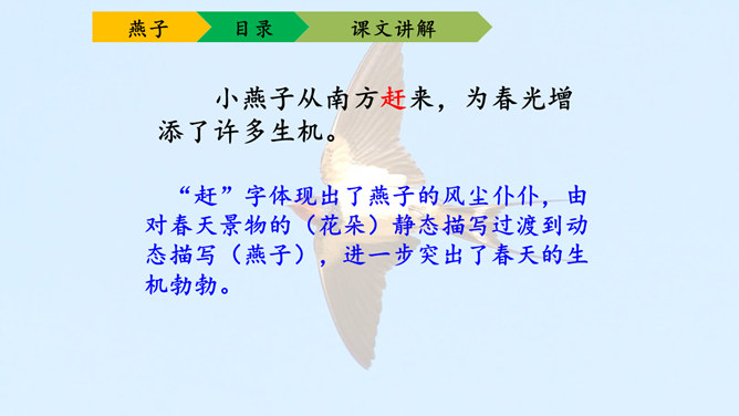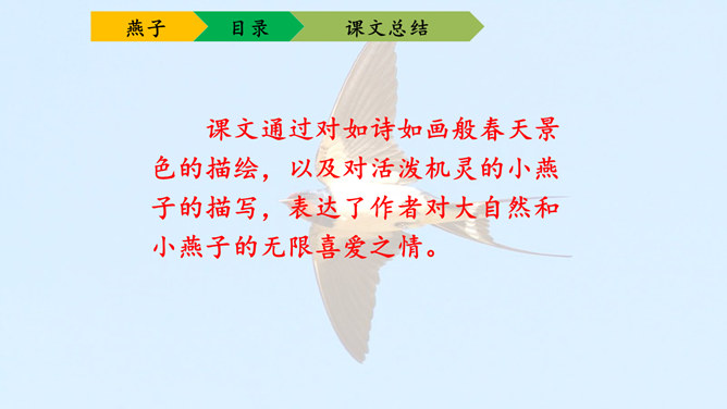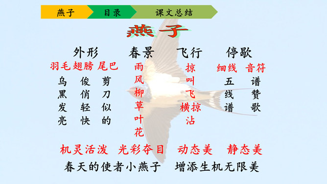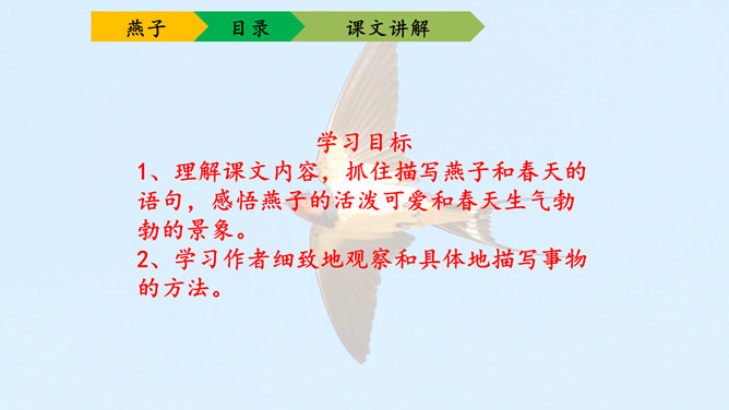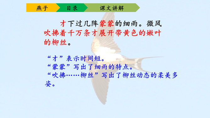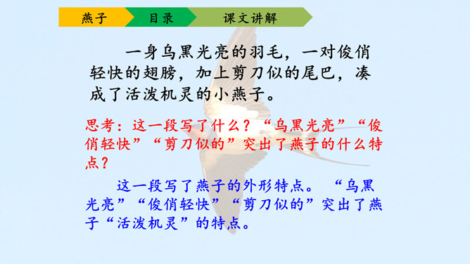 学习目标:1、理解课文内容,抓住描写燕子和春天的语句,感悟燕子的活泼可爱和春天生气勃勃的景象。2、学习作者细致地观察和具体地描写事物的方法。思考:这一段写了什么?“乌黑光亮”“俊俏轻快”“剪刀似的”突出了燕子的什么特点?这一段写了燕子的外形特点。 “乌黑光亮”“俊俏轻快”“剪刀似的”突出了燕子“活泼机灵”的特点。“才”表示时间短。“蒙蒙”写出了细雨的特点。“吹拂……柳丝”写出了柳丝动态的柔美多姿。所属专题:燕子ppt。