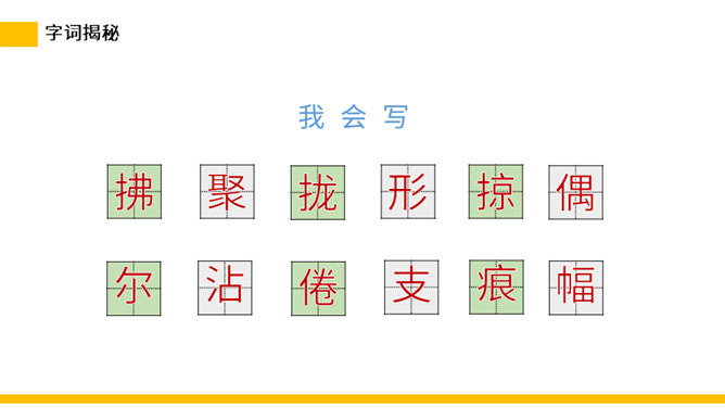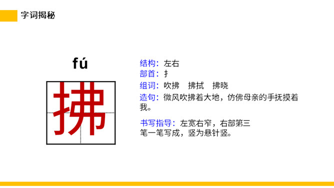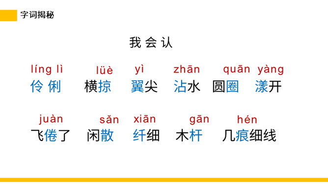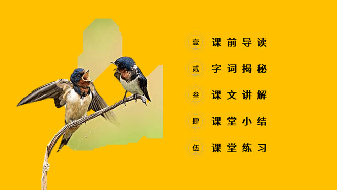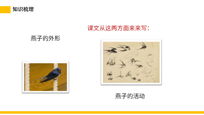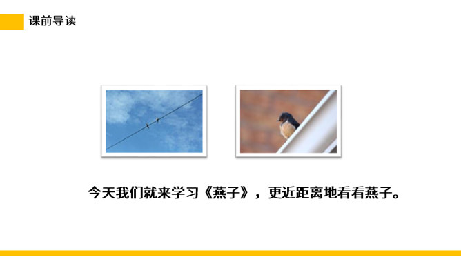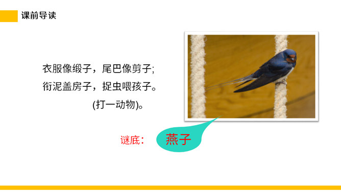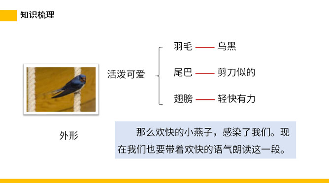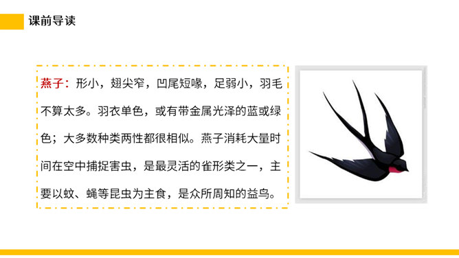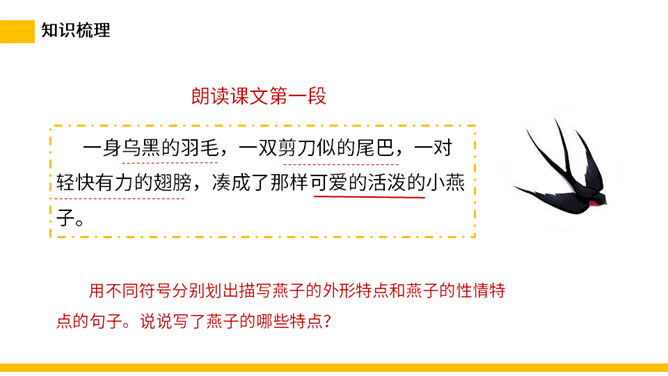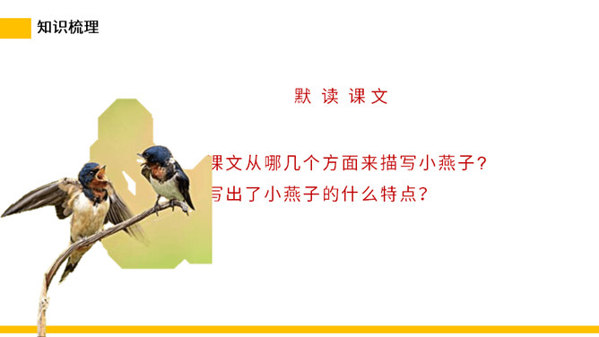 课堂小结:1.了解了会认的字,会写的字,你能说说哪些汉字是左右结构的吗?2.用自己的话说一说,课文的主要内容。那么欢快的小燕子,感染了我们。现在我们也要带着欢快的语气朗读这一段。用不同符号分别划出描写燕子的外形特点和燕子的性情特点的句子。说说写了燕子的哪些特点?课文从哪几个方面来描写小燕子?写出了小燕子的什么特点?书写指导:左窄右宽。右边的“口”要写在横中线上方,要扁一些,“田”写在横中线下。所属专题:燕子ppt。