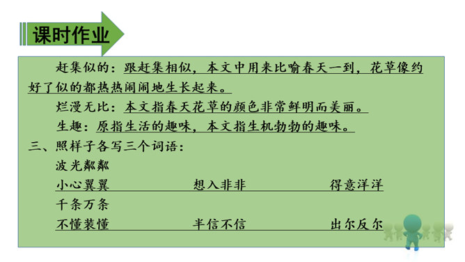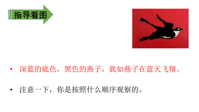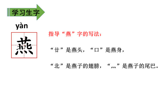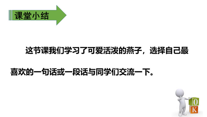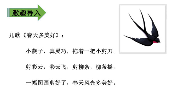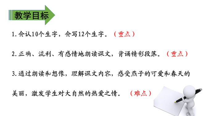 教学目标:1.会认10个生字,会写12个生字。(重点)2.正确、流利、有感情地朗读课文,背诵精彩段落。(重点)3.通过朗读和想像,理解课文内容,感受燕子的可爱和春天的美丽,激发学生对大自然的热爱之情。 (难点)1.会认10个生字,会写12个生字。(重点)2.正确、流利、有感情地朗读课文。(重点)注意一下,你是按照什么顺序观察的。这节课我们学习了可爱活泼的燕子,选择自己最喜欢的一句话或一段话与同学们交流一下。所属专题:燕子ppt。