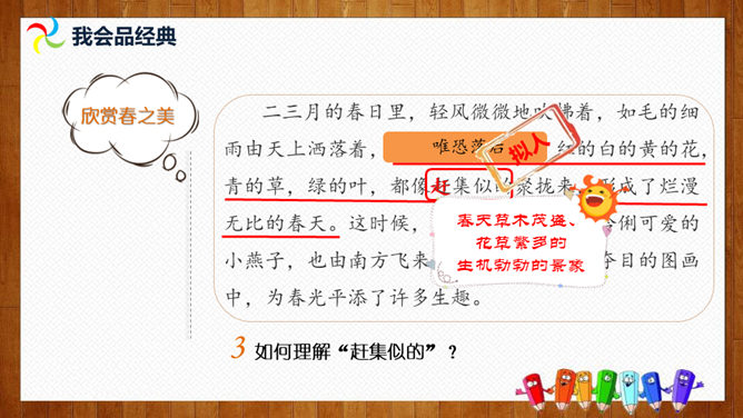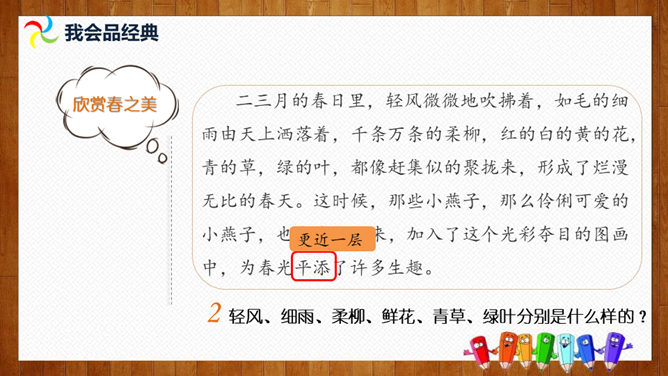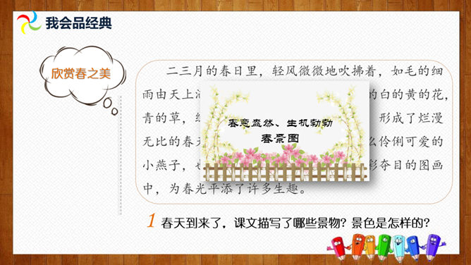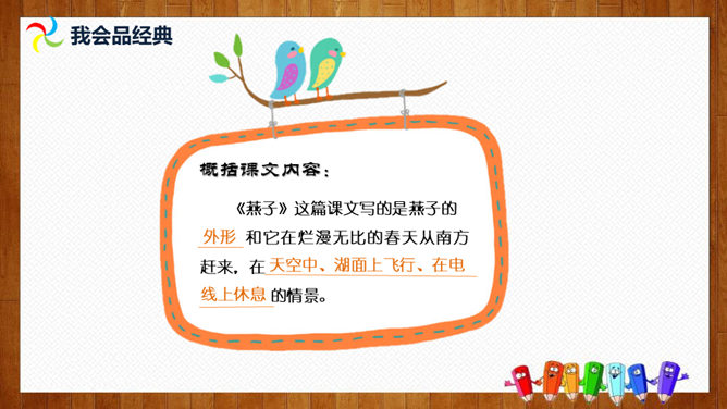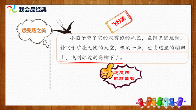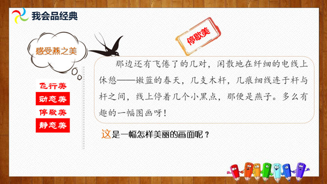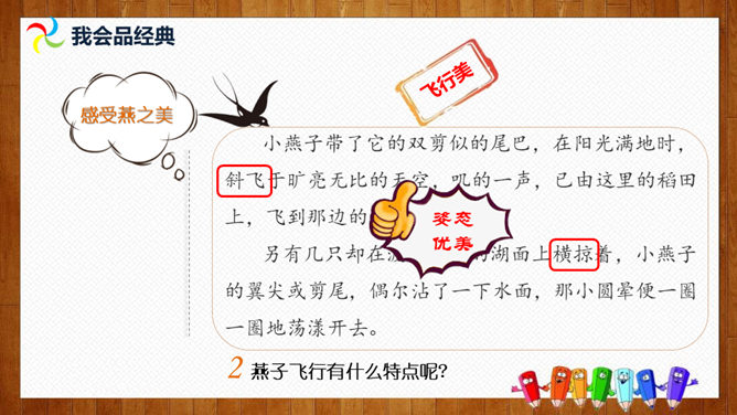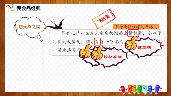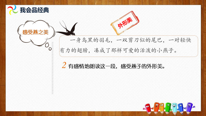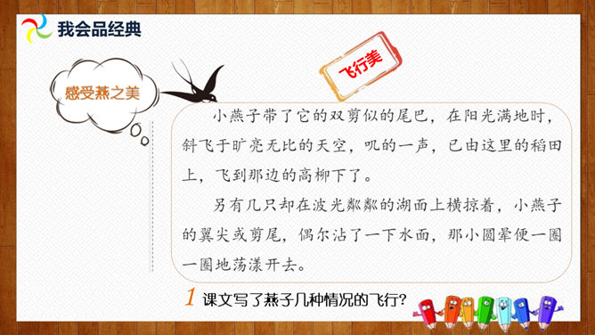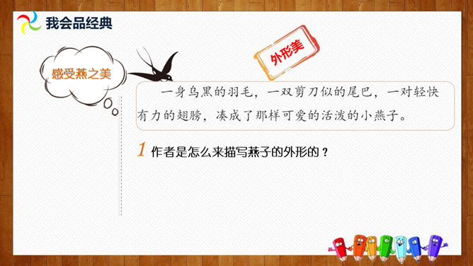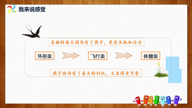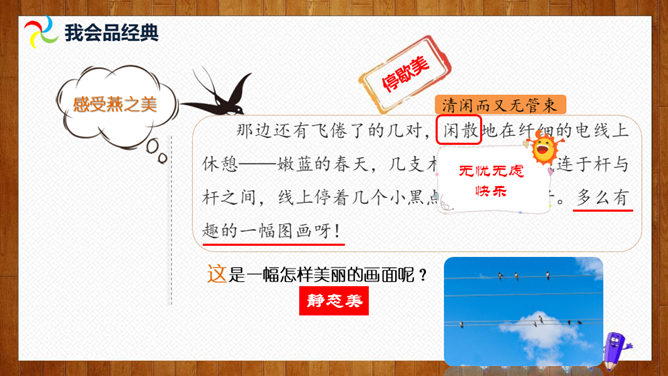 朗读课文,背诵第1~3自然段。品读文中优美生动的语句,体会作者对燕子的喜爱之情。作者是怎么来描写燕子的外形的?有感情地朗读这一段,感受燕子的外形美。课文写了燕子几种情况的飞行?燕子飞行有什么特点呢?这是一幅怎样美丽的画面呢?春天到来了,课文描写了哪些景物? 景色是怎样的?轻风、细雨、柔柳、鲜花、青草、绿叶分别是什么样的?如何理解“赶集似的”?如何理解“为春光平添了许多生趣”?所属专题:燕子ppt。