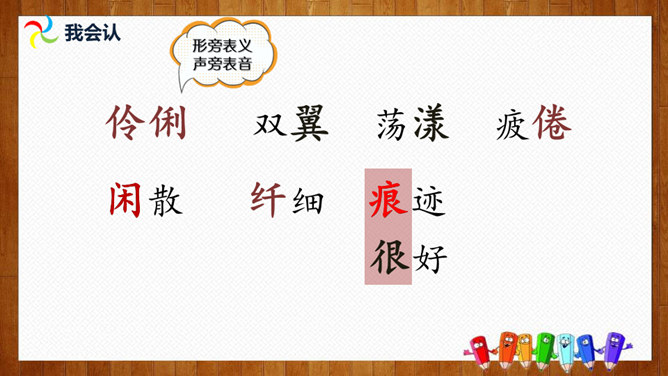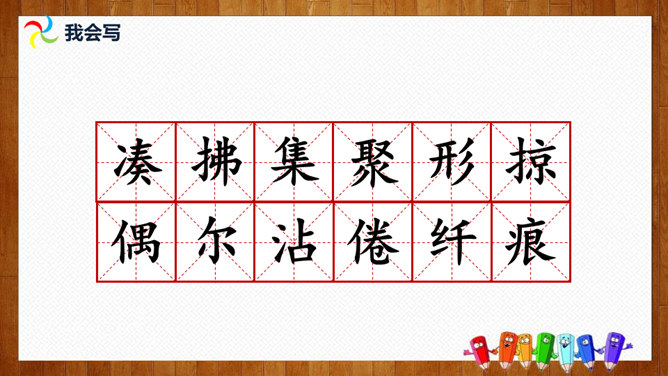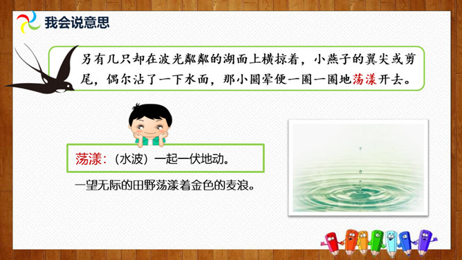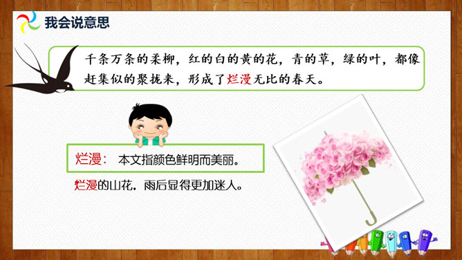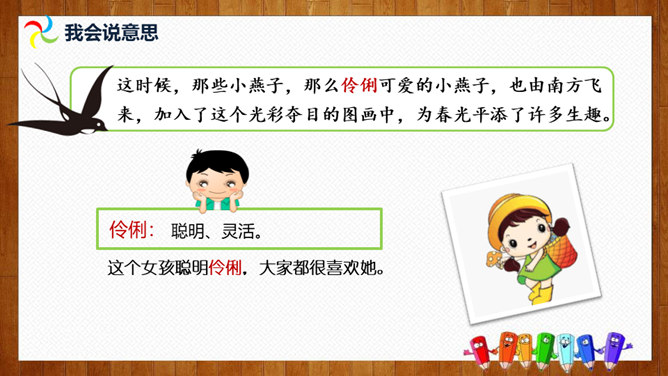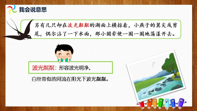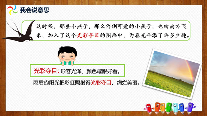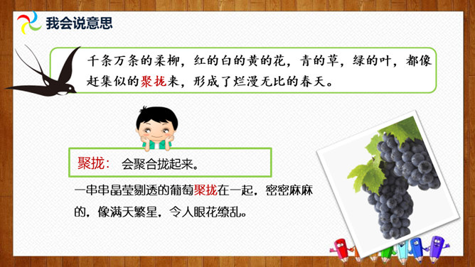 掌握本课的生字。理解重点词语的意思。聚拢:会聚合拢起来。一串串晶莹剔透的葡萄聚拢在一起,密密麻麻的,像满天繁星,令人眼花缭乱。烂漫:本文指颜色鲜明而美丽。烂漫的山花,雨后显得更加迷人。伶俐:聪明、灵活。这个女孩聪明伶俐,大家都很喜欢她。光彩夺目:形容光泽、颜色耀眼好看。雨后的阳光把彩虹照射得光彩夺目,绚烂美丽。波光粼粼:形容波光明净。白丝带似的河流在阳光下波光粼粼。所属专题:燕子ppt。