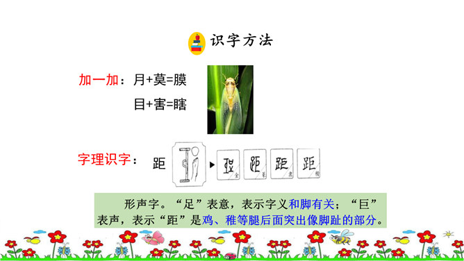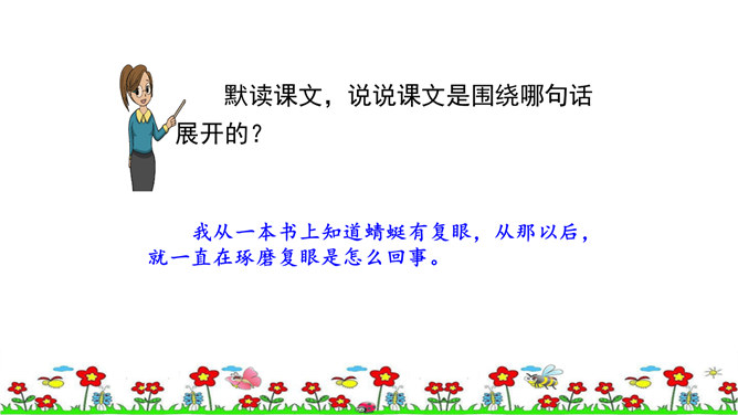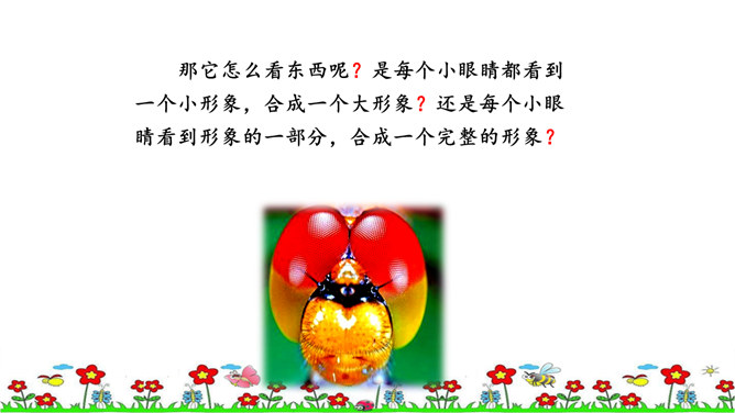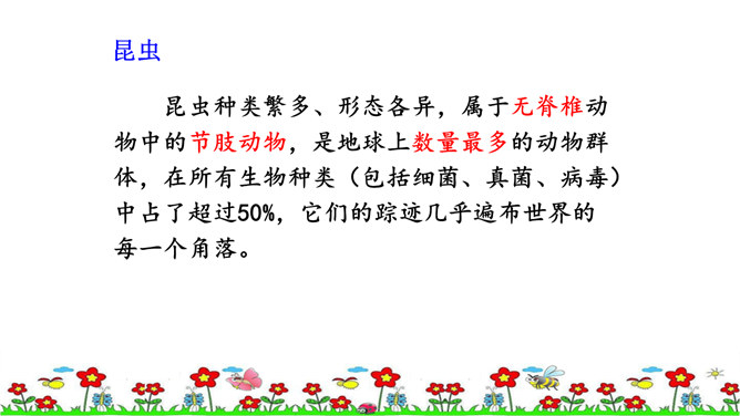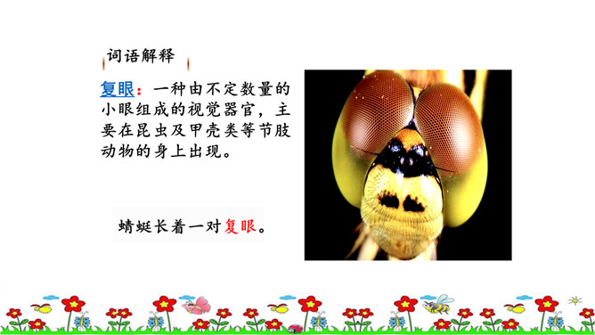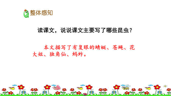 “顺顺溜溜”“严丝合缝”写出了瓢虫翅膀的特点。把瓢虫的“膜翅”比作“黑绸衬裙”,形象生动地写出了瓢虫膜翅的外形。小讨论:和原句对比读,哪句话给你印象更为深刻?想一想:课文介绍了哪几种昆虫?它们有什么特点?蜻蜓、苍蝇的眼睛是复眼。花大姐有益虫也有害虫。独角仙的力气很大。蚂蚱飞起来会咯咯作响,形态比较好画。蜻蜓能捕捉害虫,是我们人类的朋友,请大家要保护蜻蜓!所属专题:昆虫备忘录ppt。