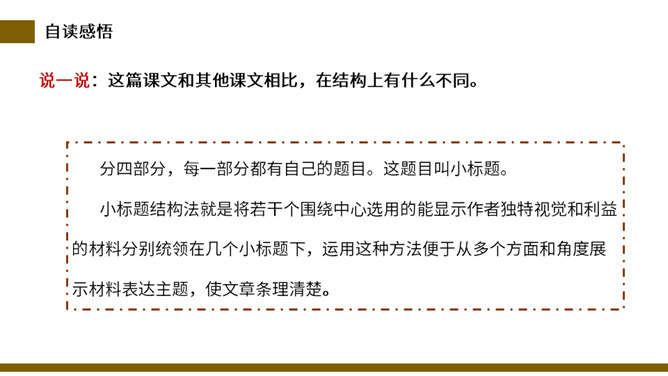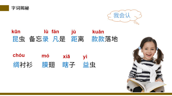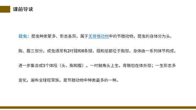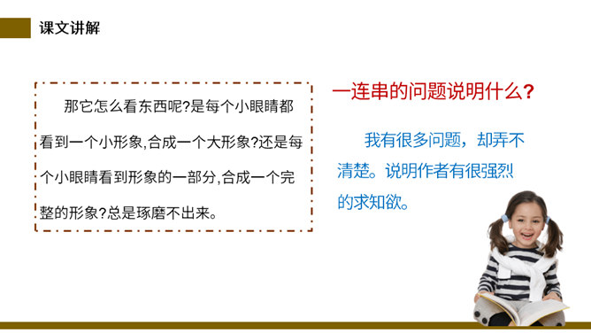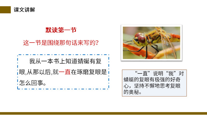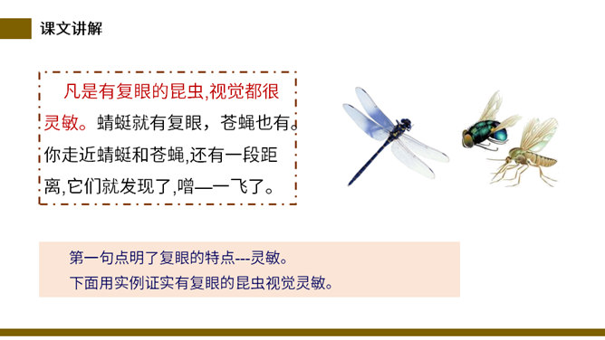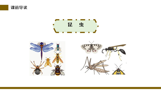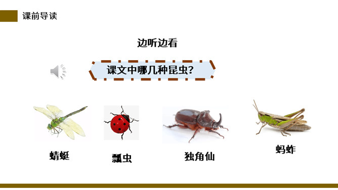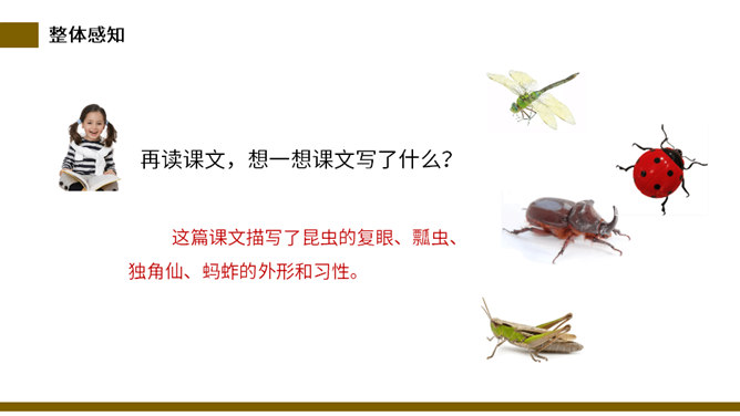 说一说:这篇课文和其他课文相比,在结构上有什么不同。分四部分,每一部分都有自己的题目。这题目叫小标题。小标题结构法就是将若干个围绕中心选用的能显示作者独特视觉和利益的材料分别统领在几个小标题下,运用这种方法便于从多个方面和角度展示材料表达主题,使文章条理清楚。自读检查:指名读课文,同学检查字音是否正确。分节读课文,说说这篇文章写了什么。这篇课文描写了昆虫的复眼、瓢虫、独角仙、蚂蚱的外形和习性。所属专题:昆虫备忘录ppt。