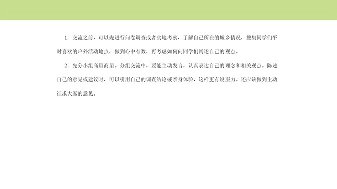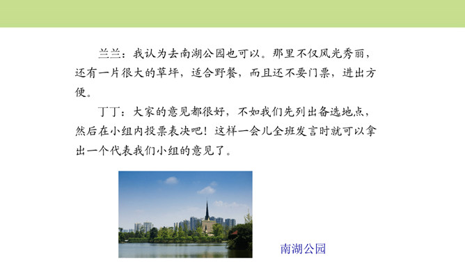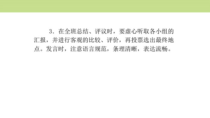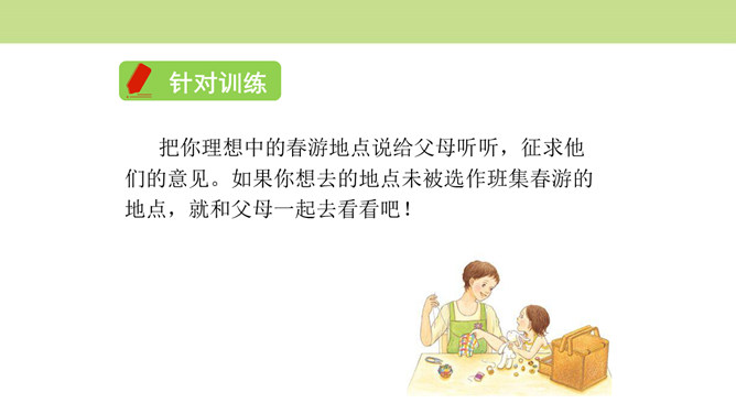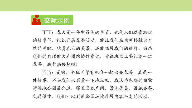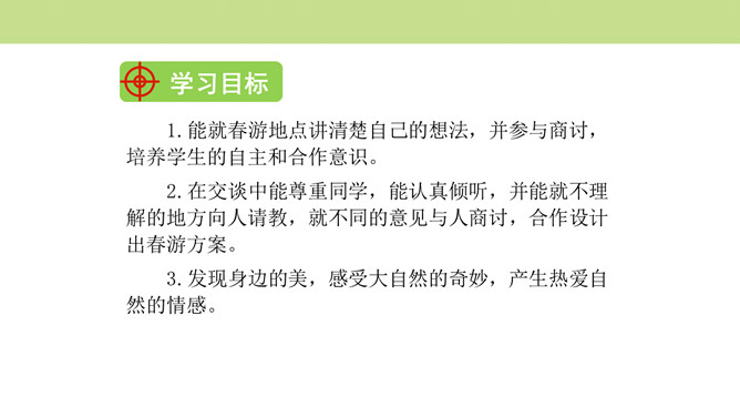 1.能就春游地点讲清楚自己的想法,并参与商讨,培养学生的自主和合作意识。 2.在交谈中能尊重同学,能认真倾听,并能就不理解的地方向人请教,就不同的意见与人商讨,合作设计出春游方案。3.发现身边的美,感受大自然的奇妙,产生热爱自然的情感。交流时,要说请自己想到哪儿春游,为什么想去这个地方春游,比如这个地方有什么美丽的景色,可以开展哪些活动。要讲得细致、有条理。所属专题:春游去哪儿玩ppt。