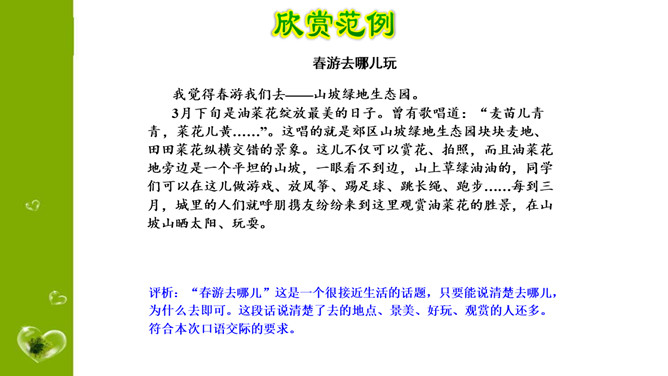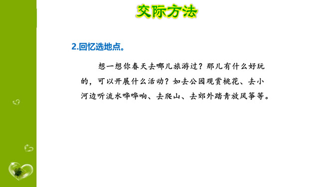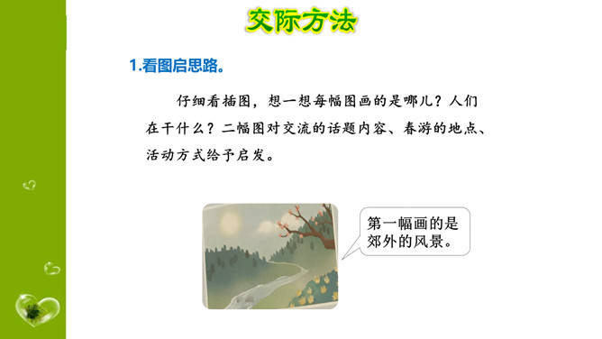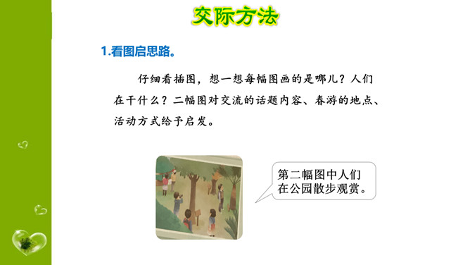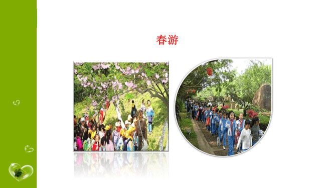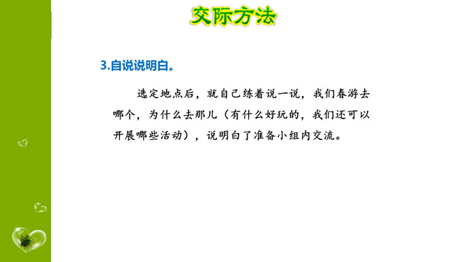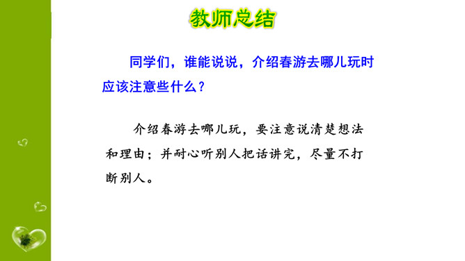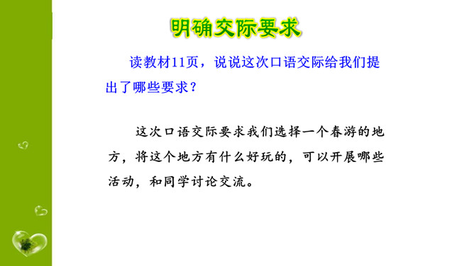 说说你想去哪里春游?这节口语交际课我们就来和同学交流你的想法,谈谈你的看法。读教材11页,说说这次口语交际给我们提出了哪些要求?这次口语交际要求我们选择一个春游的地方,将这个地方有什么好玩的,可以开展哪些活动,和同学讨论交流。说:每个人只能选择一个地方进行推荐。要说清楚想法和理由。听:耐心听别人把话说完;尽量不打断别人。仔细看插图,想一想每幅图画的是哪儿?人们在干什么?所属专题:春游去哪儿玩ppt。