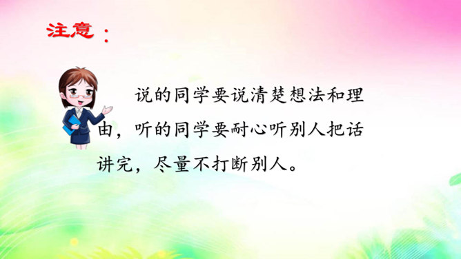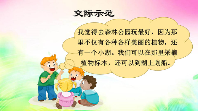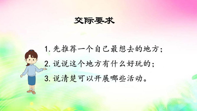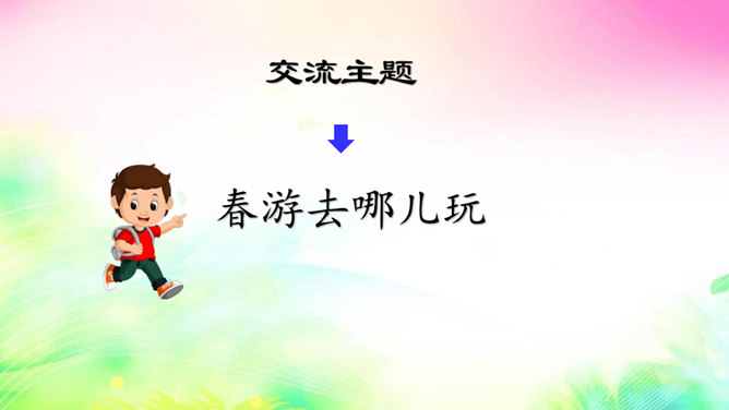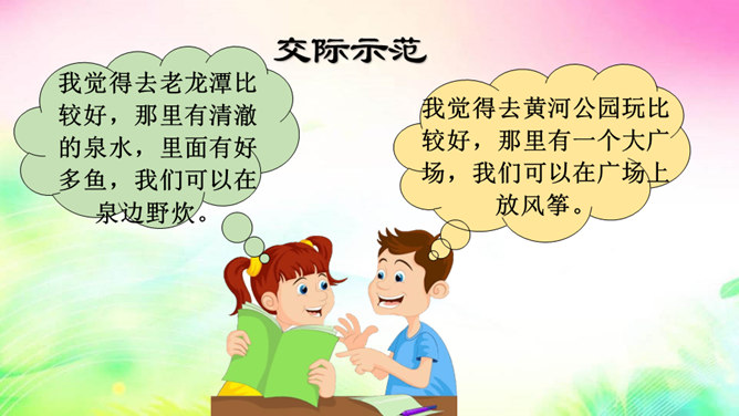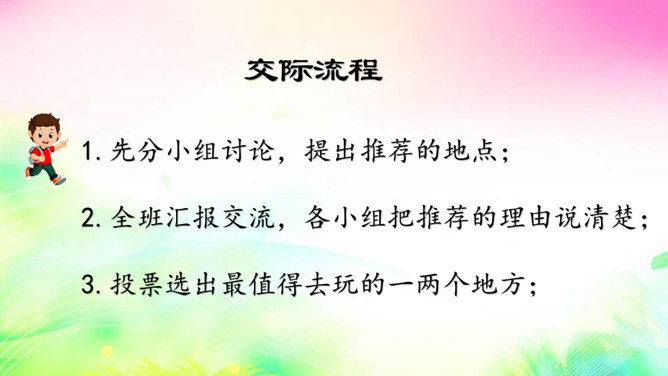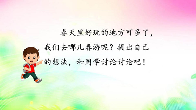 春天里好玩的地方可多了,我们去哪儿春游呢?提出自己的想法,和同学讨论讨论吧!交际流程:1.先分小组讨论,提出推荐的地点;2.全班汇报交流,各小组把推荐的理由说清楚;3.投票选出最值得去玩的一两个地方;交际要求:1.先推荐一个自己最想去的地方;2.说说这个地方有什么好玩的;3.说清楚可以开展哪些活动。说的同学要说清楚想法和理由,听的同学要耐心听别人把话讲完,尽量不打断别人。所属专题:春游去哪儿玩ppt。