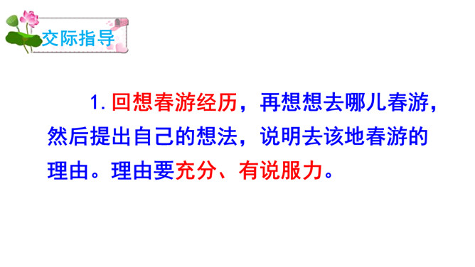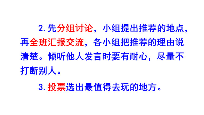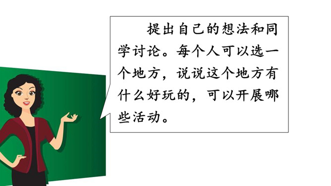 提出自己的想法和同学讨论。每个人可以选一个地方,说说这个地方有什么好玩的,可以开展哪些活动。1.回想春游经历,再想想去哪儿春游,然后提出自己的想法,说明去该地春游的理由。理由要充分、有说服力。2.先分组讨论,小组提出推荐的地点,再全班汇报交流,各小组把推荐的理由说清楚。倾听他人发言时要有耐心,尽量不打断别人。3.投票选出最值得去玩的地方。所属专题:春游去哪儿玩ppt。