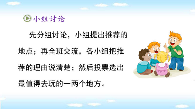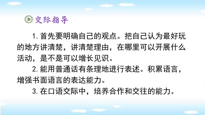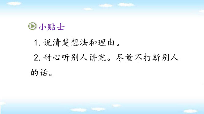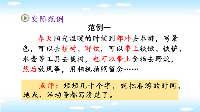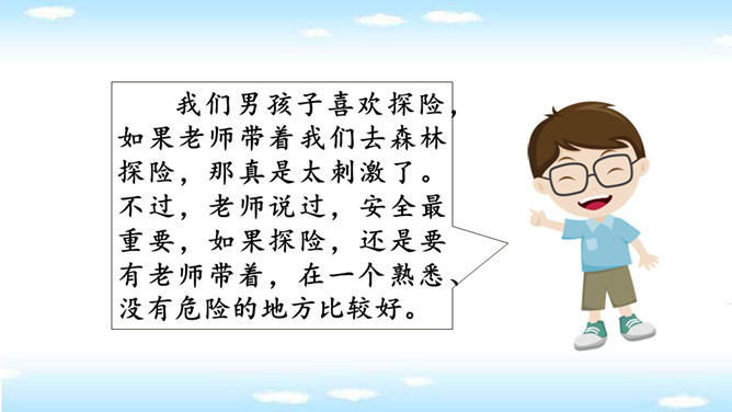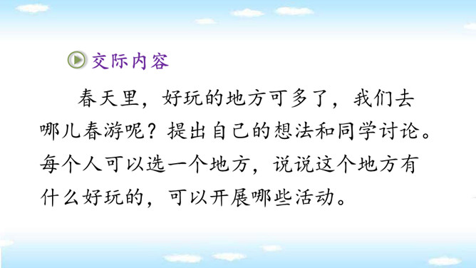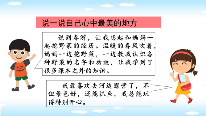 1.说清楚想法和理由。2.耐心听别人讲完。尽量不打断别人的话。说到春游,让我想起和妈妈一起挖野菜的经历。温暖的春风吹着,妈妈一边挖野菜,一边教我认识各种野菜的名字和功效,让我学到了很多课本之外的知识。我最喜欢去河边露营了,不但景色好,还能抓鱼,我总能玩得特别开心。我们男孩子喜欢探险,如果老师带着我们去森林探险,那真是太刺激了。不过,老师说过,安全最重要,如果探险,还是要有老师带着,在一个熟悉、没有危险的地方比较好。所属专题:春游去哪儿玩ppt。