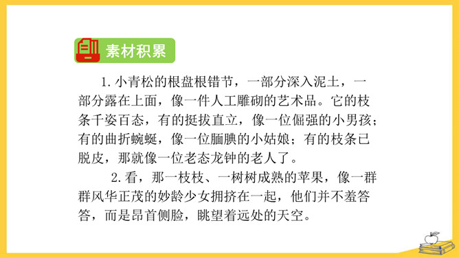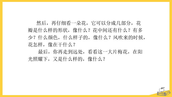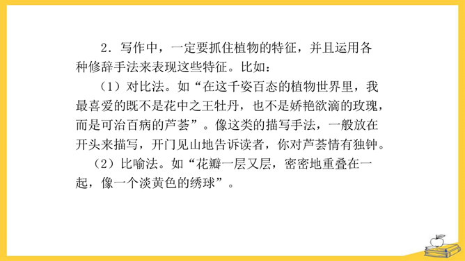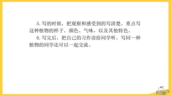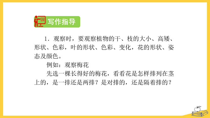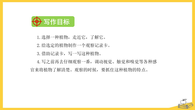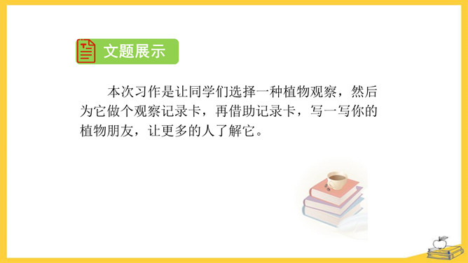 本次习作是让同学们选择一种植物观察,然后为它做个观察记录卡,再借助记录卡,写一写你的植物朋友,让更多的人了解它。1.观察时,要观察植物的干、枝的大小、高矮、形状、色彩,叶的形状、色彩、变化,花的形状、姿态及颜色。例如:观察梅花,先选一棵长得好的梅花,看看花是怎样排列在茎上的,是一排还是两排?是对排的,还是隔着排的?然后,再仔细看一朵花,它可以分成几部分,花瓣是什么样的形状,像什么?所属专题:我的植物朋友ppt。