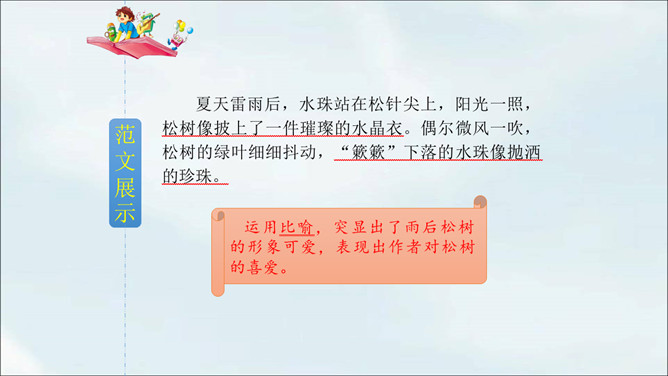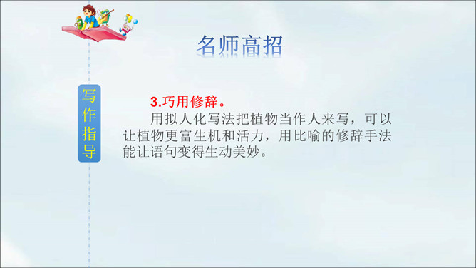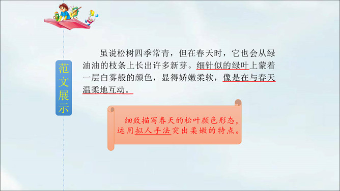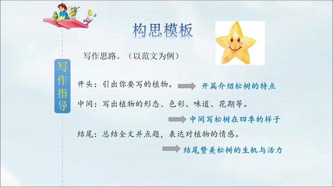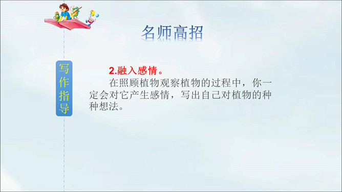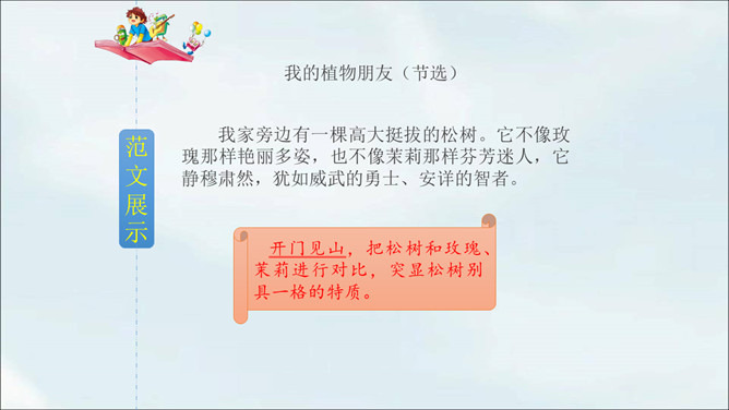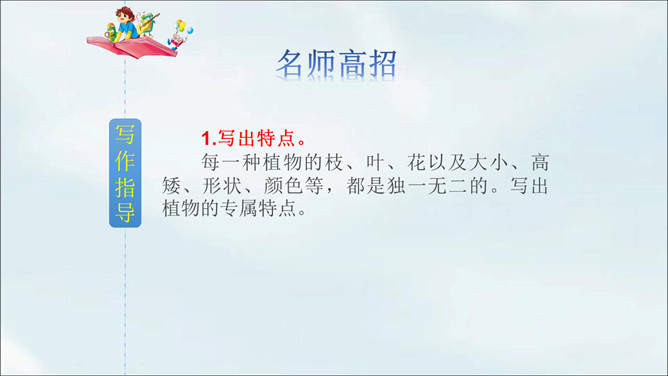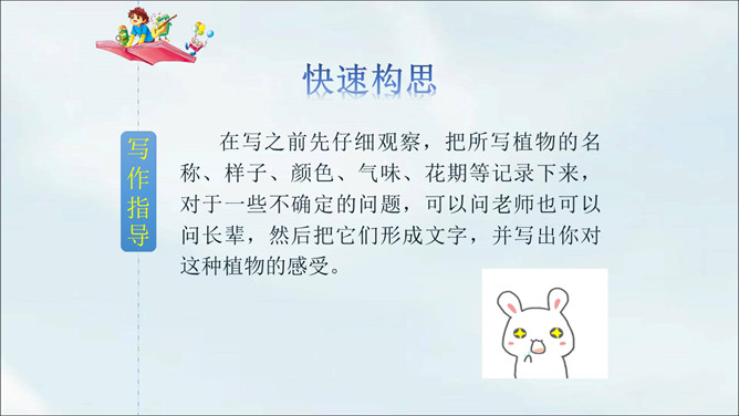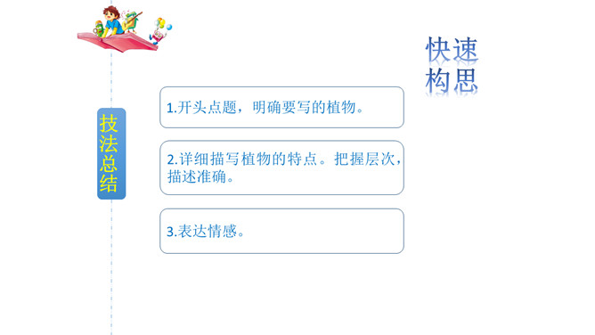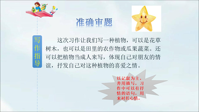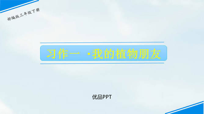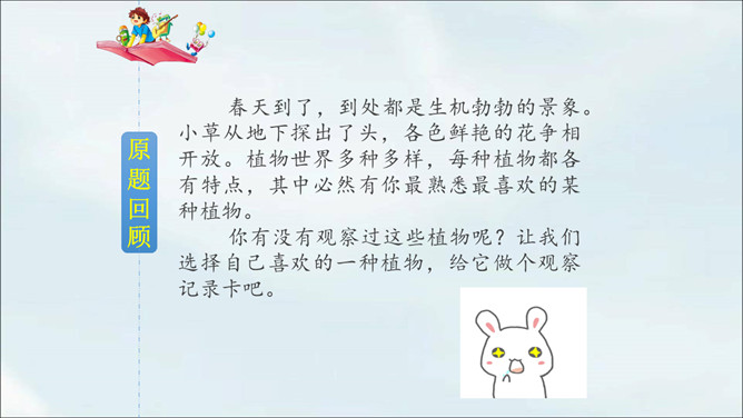 春天到了,到处都是生机勃勃的景象。小草从地下探出了头,各色鲜艳的花争相开放。植物世界多种多样,每种植物都各有特点,其中必然有你最熟悉最喜欢的某种植物。你有没有观察过这些植物呢?让我们选择自己喜欢的一种植物,给它做个观察记录卡吧。这次习作让我们写一种植物,可以是花草树木,也可以是田里的农作物或瓜果蔬菜。还可以把植物当成人来写,体现自己对朋友的情谊,抒发自己对这种植物的喜爱之情。所属专题:我的植物朋友ppt。