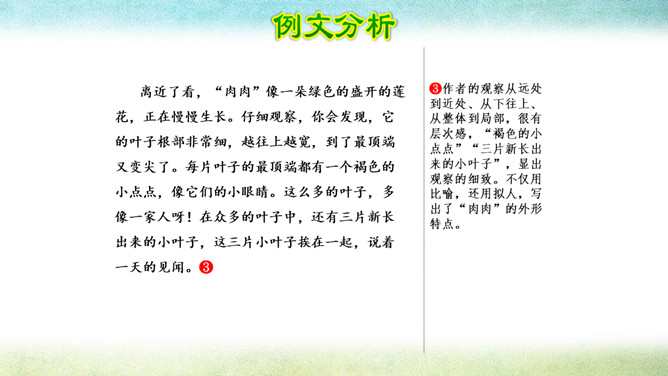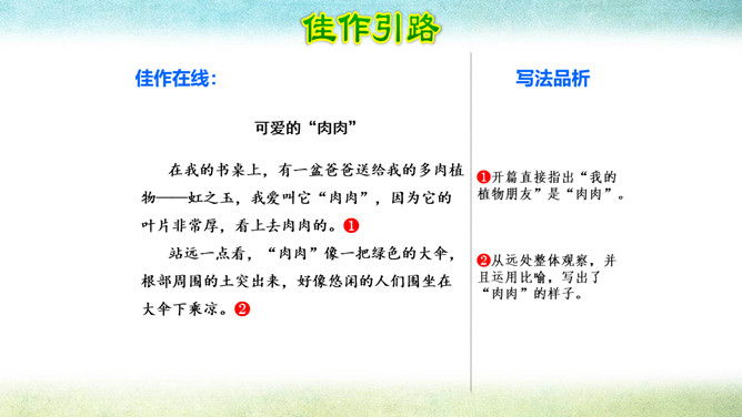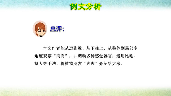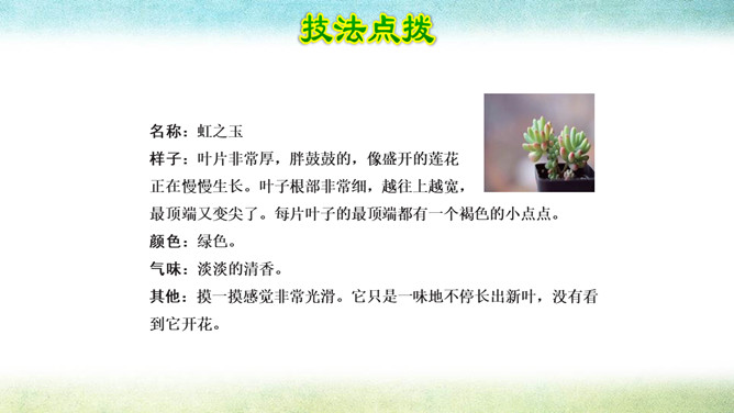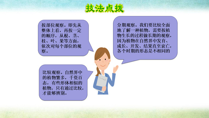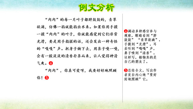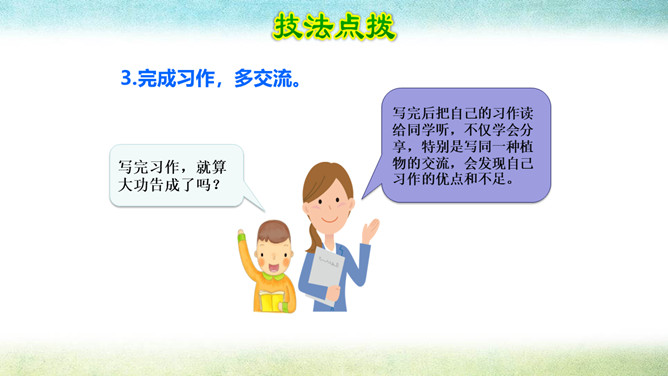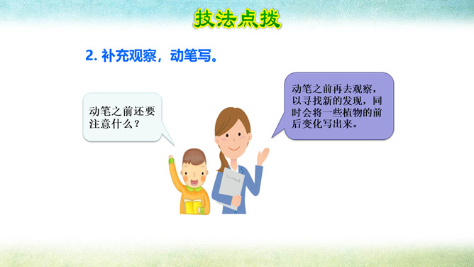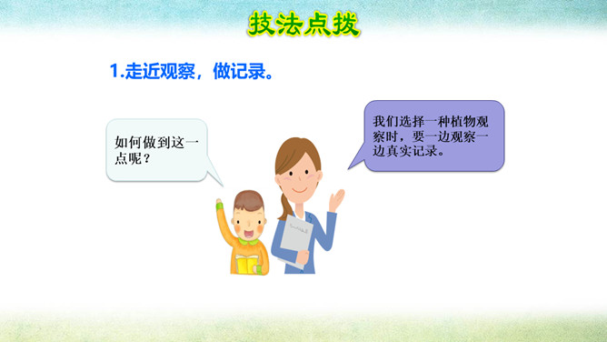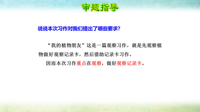 为自己的植物朋友做个观察记录卡吧。借助记录卡,写一写你的植物朋友,让更多的人了解它。说说本次习作对我们提出了哪些要求? “我的植物朋友”这是一篇观察习作,就是先观察植物做好观察记录卡,然后借助记录卡习作。因而本次习作重点在观察,做好观察记录卡。比较观察。自然界中的植物繁多,千资百态,有些形体相似的植物,只有通过比较,才能够辨别。写完习作,就算大功告成了吗?所属专题:我的植物朋友ppt。