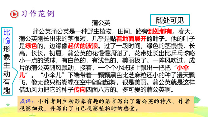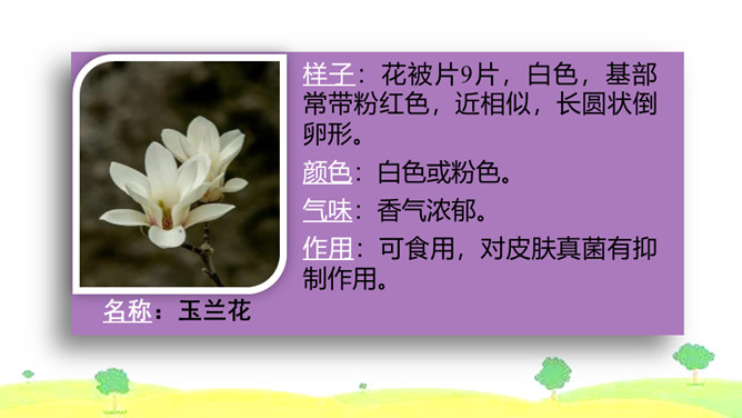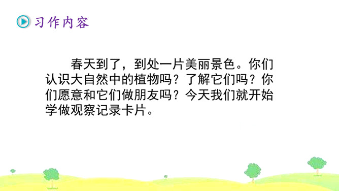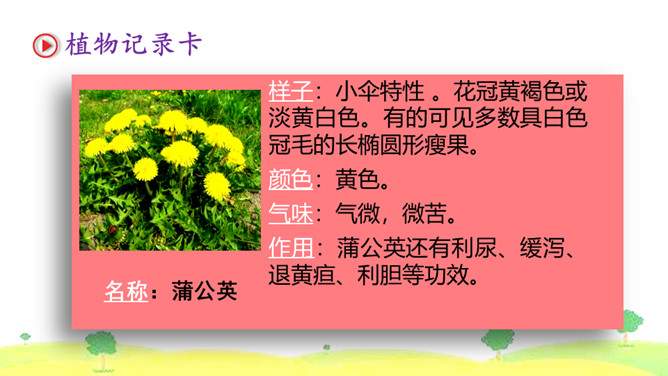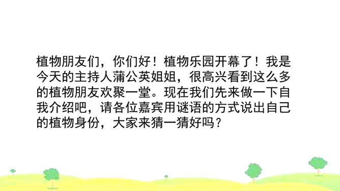 植物朋友们,你们好!植物乐园开幕了!我是今天的主持人蒲公英姐姐,很高兴看到这么多的植物朋友欢聚一堂。现在我们先来做一下自我介绍吧,请各位嘉宾用谜语的方式说出自己的植物身份,大家来猜一猜好吗?春天到了,到处一片美丽景色。你们认识大自然中的植物吗?了解它们吗?你们愿意和它们做朋友吗?今天我们就开始学做观察记录卡片。观察某种植物的时候要有一定的顺序,思路要合理。所属专题:我的植物朋友ppt。