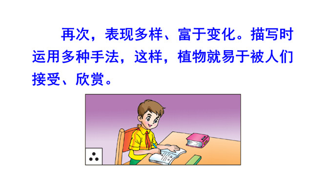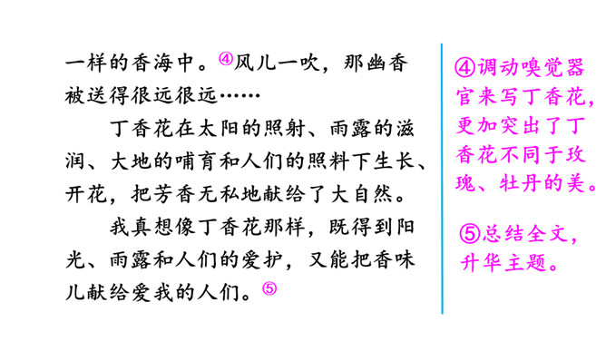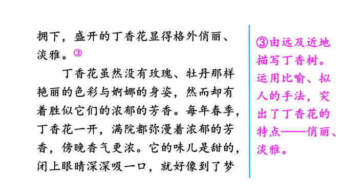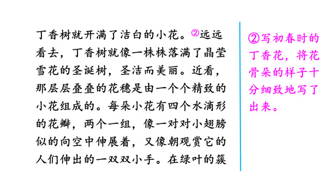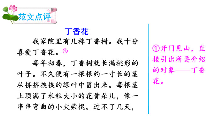 ①开门见山,直接引出所要介绍的对象——丁香花。②写初春时的丁香花,将花骨朵的样子十分细致地写了出来。③由远及近地描写丁香树。运用比喻、拟人的手法,突出了丁香花的特点——俏丽、淡雅。④调动嗅觉器官来写丁香花,更加突出了丁香花不同于玫瑰、牡丹的美。⑤总结全文,升华主题。多么幸福啊,小作者院子里的丁香花一定给予了他无限的乐趣和美好的享受,否则小作者是写不出这么美的文章的。文章语言生动。所属专题:我的植物朋友ppt。