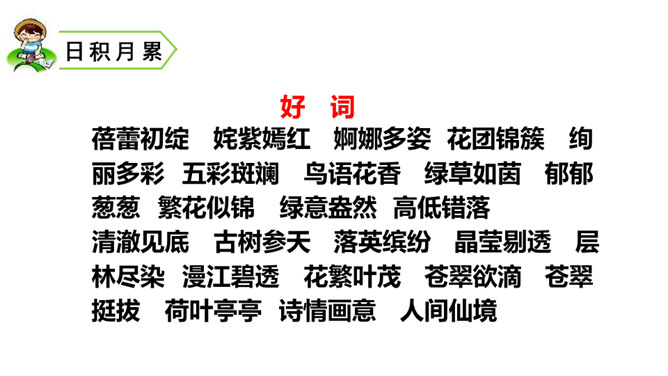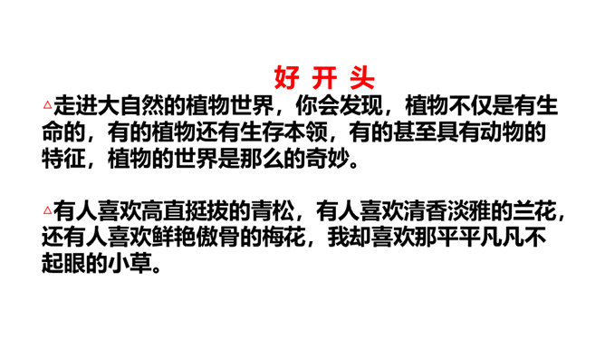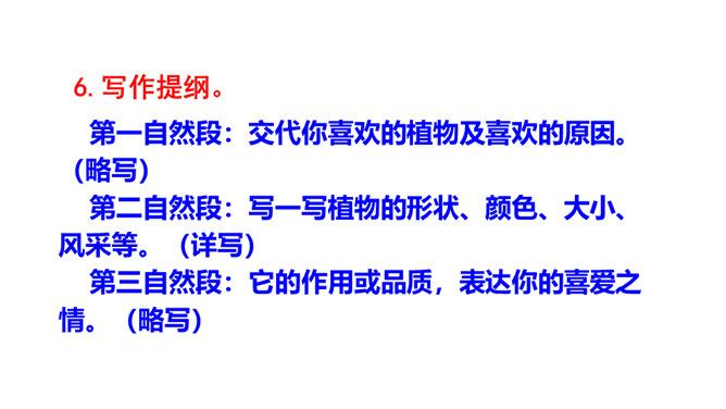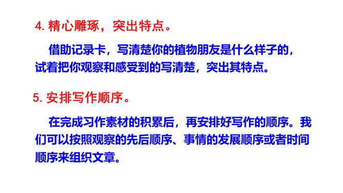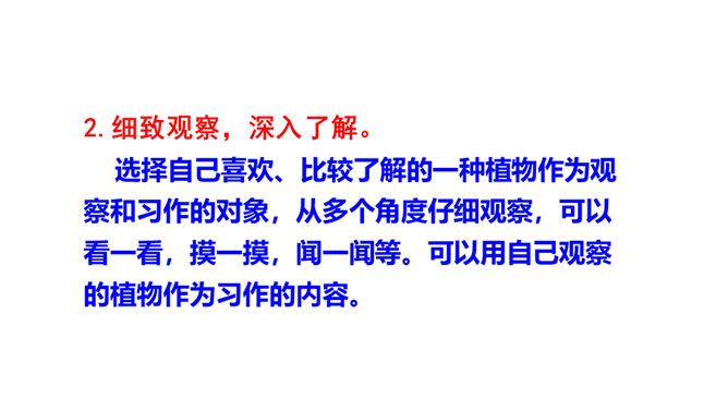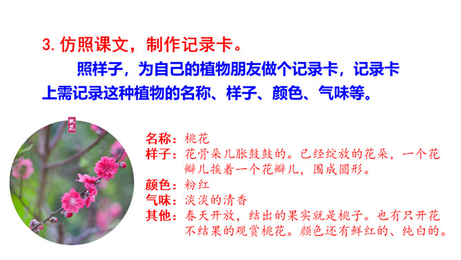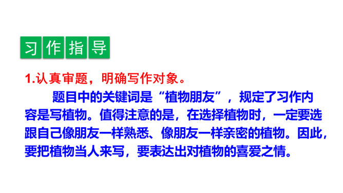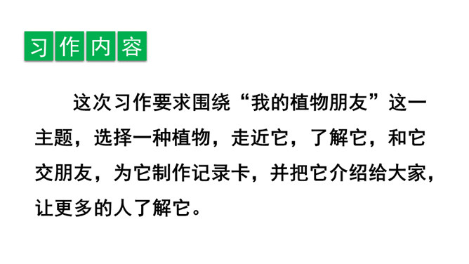 题目中的关键词是“植物朋友”,规定了习作内容是写植物。值得注意的是,在选择植物时,一定要选跟自己像朋友一样熟悉、像朋友一样亲密的植物。因此,要把植物当人来写,要表达出对植物的喜爱之情。选择自己喜欢、比较了解的一种植物作为观察和习作的对象,从多个角度仔细观察,可以看一看,摸一摸,闻一闻等。可以用自己观察的植物作为习作的内容。照样子,为自己的植物朋友做个记录卡。所属专题:我的植物朋友ppt。