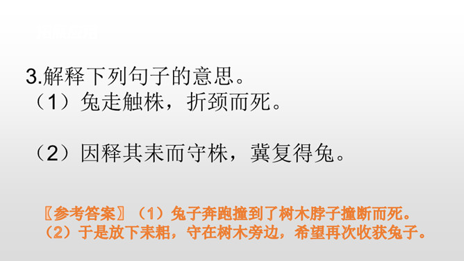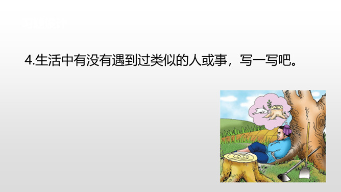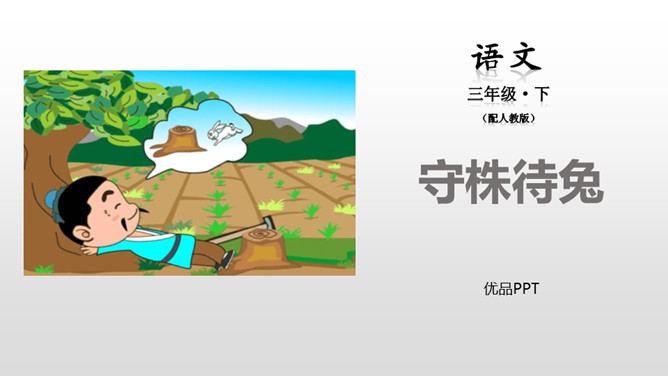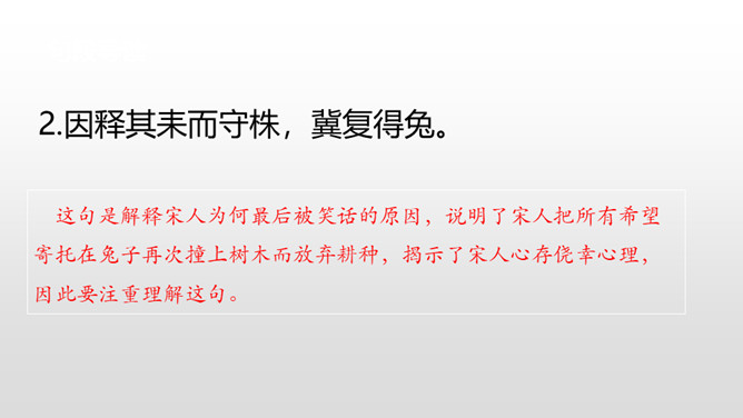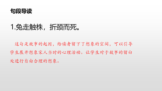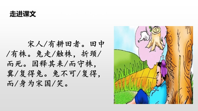 学生自由读课文。1.借助拼音,读通课文。2.注意停顿和断句。这句是故事的起因,给读者留下了想象的空间,可以引导学生展开想象宋人当时的心理活动。让学生对于故事的留白处进行自由合理的想象。这句是解释宋人为何最后被笑话的原因,说明了宋人把所有希望寄托在兔子再次撞上树木而放弃耕种,揭示了宋人心存侥幸心理,因此要注重理解这句。生活中有没有遇到过类似的人或事,写一写吧。所属专题:守株待兔ppt。