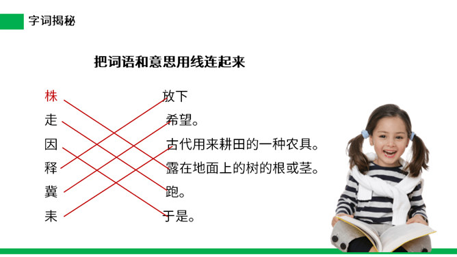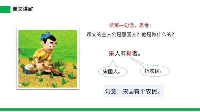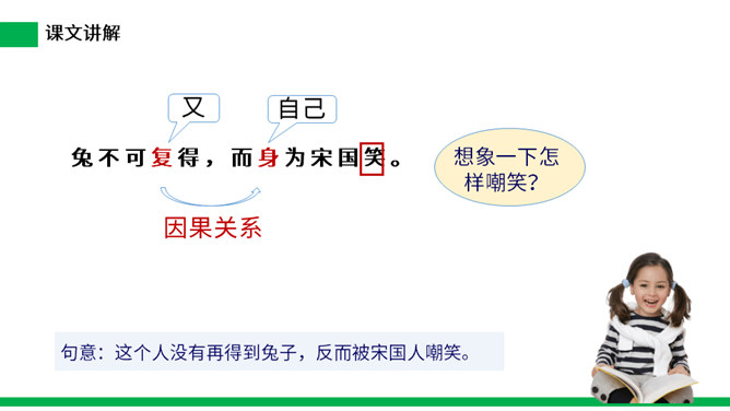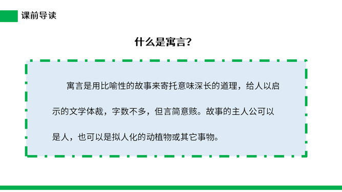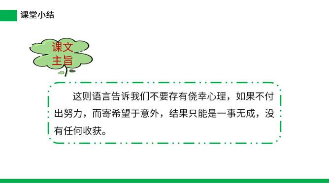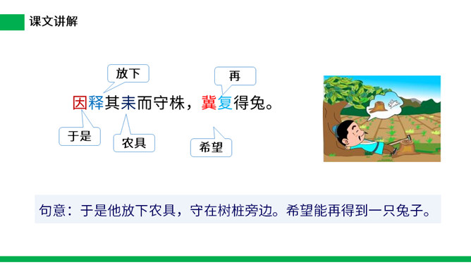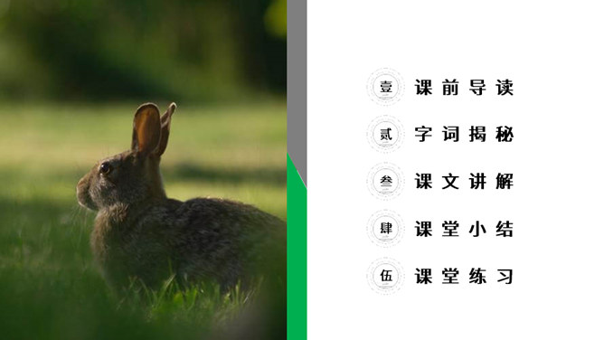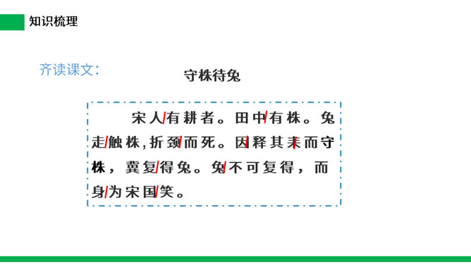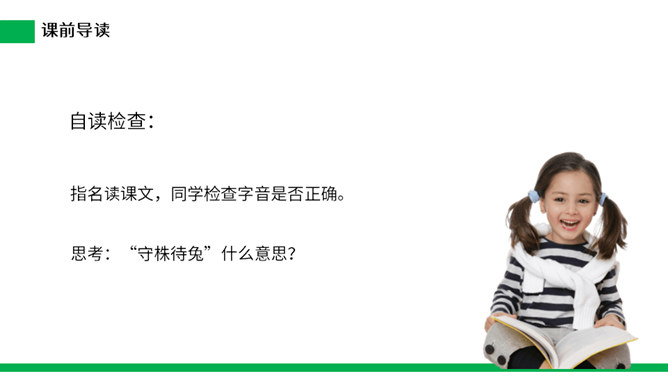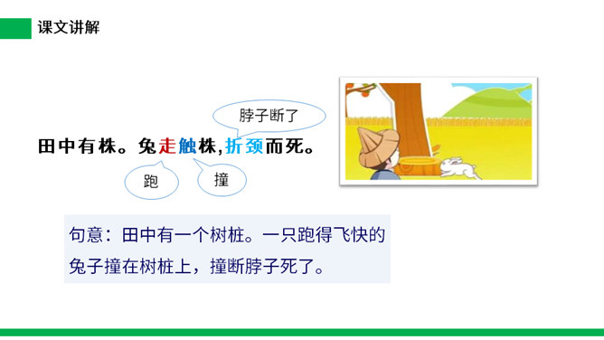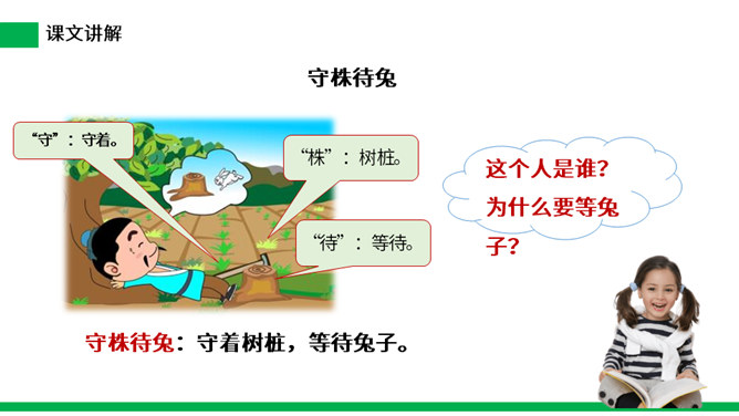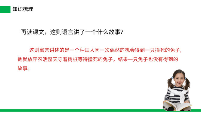 寓言是用比喻性的故事来寄托意味深长的道理,给人以启示的文学体裁,字数不多,但言简意赅。故事的主人公可以是人,也可以是拟人化的动植物或其它事物。自读课文:(1)不认识的字可以看拼音,或者请教老师和同学。(2)读准每一个字的字音,圈出生字词;(3)读通每个句子,读不通顺的多读几遍。这则寓言讲述的是一个种田人因一次偶然的机会得到一只撞死的兔子,他就放弃农活整天守着树桩等待撞死的兔子,结果一只兔子也没有得到的故事。所属专题:守株待兔ppt。