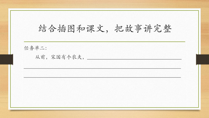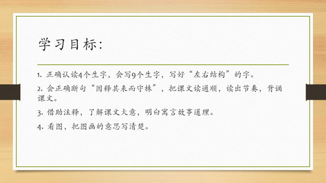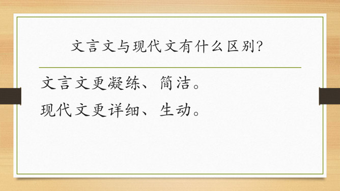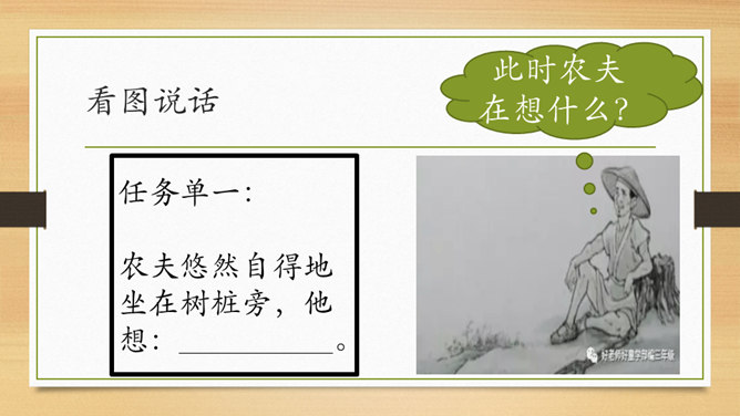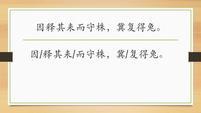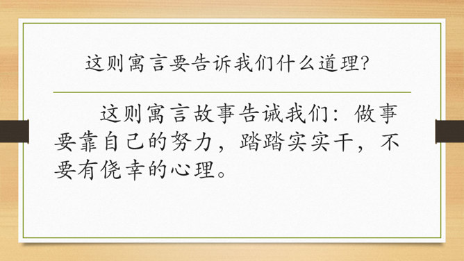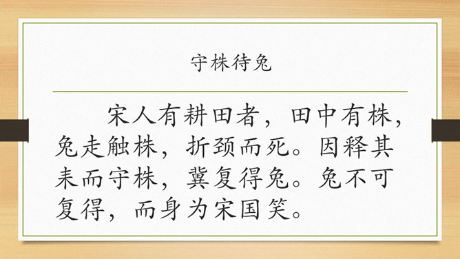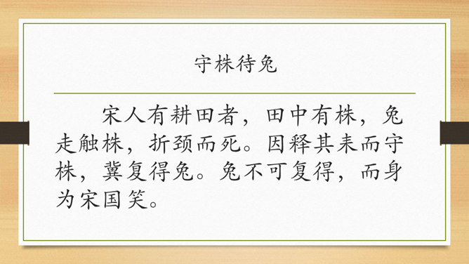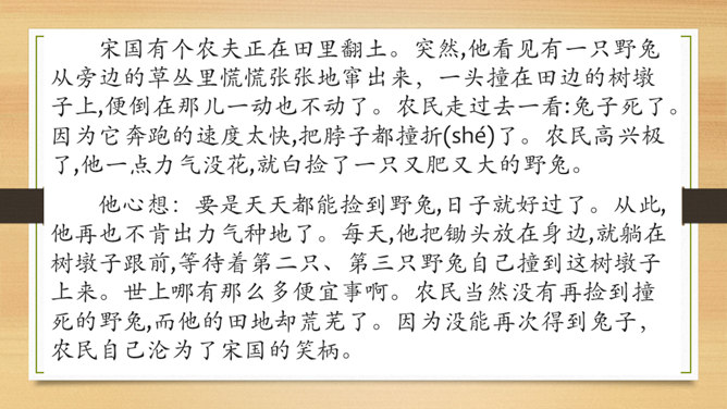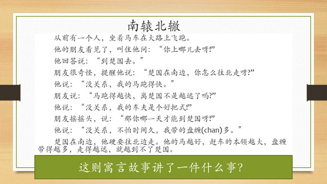 故事里的商人犯了什么错?这则寓言故事告诉我们一个什么道理?这则寓言故事告诫我们:无论做什么事、都要首先看准方向、才能充分发挥自己的有利条件;如果方向错了、那么有利条件只会起到相反的作用。文言文与现代文有什么区别?文言文更凝练、简洁。现代文更详细、生动。如果你见到农夫,你会怎么劝告他?把你想对他说的话写下来。从《中国古代寓言故事》中挑选一两则寓言来阅读。所属专题:守株待兔ppt。