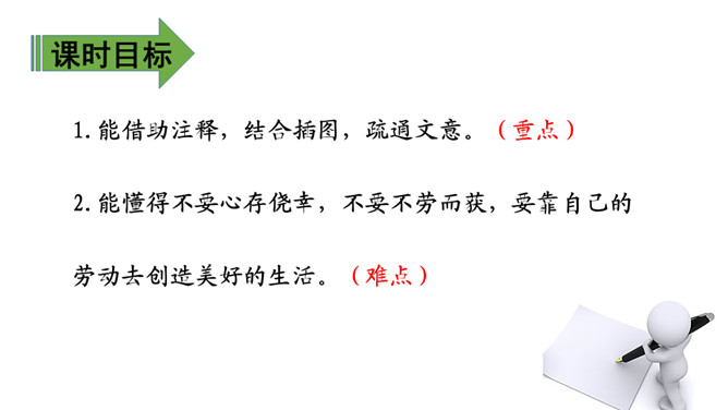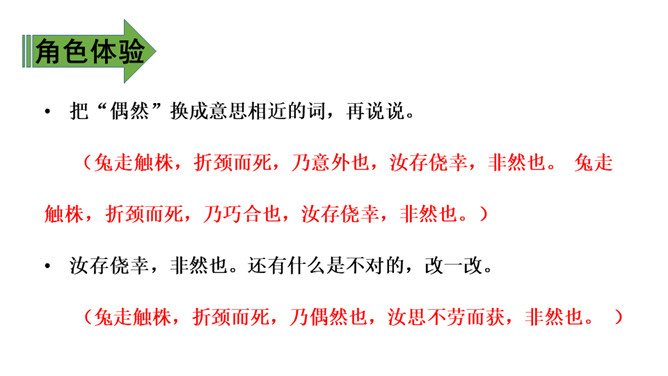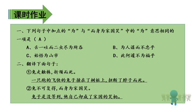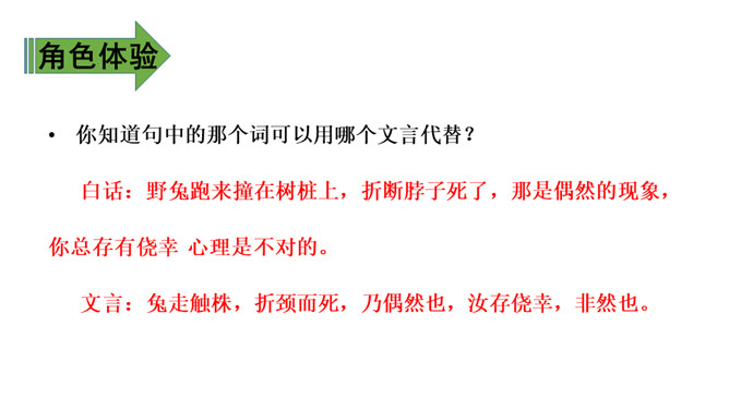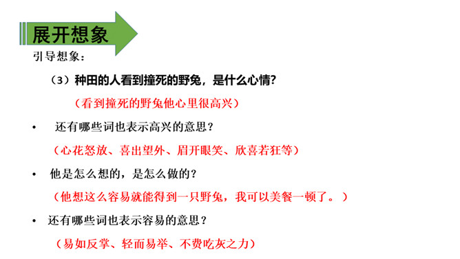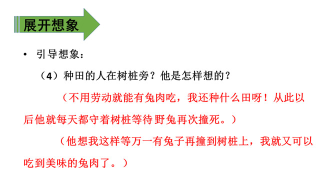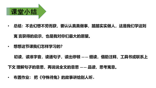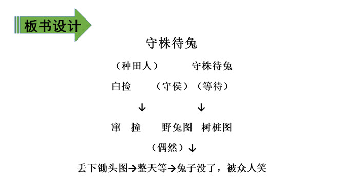 1.能借助注释,结合插图,疏通文意。(重点)2.能懂得不要心存侥幸,不要不劳而获,要靠自己的劳动去创造美好的生活。(难点)小结:正是因为特殊的原因这只野兔急于逃命才慌不择路跑到了种田人的地 里,因为要逃命才跑的像离弦的箭一样,才致使它一下子撞在树桩上,折断脖子而 死。所以,这只野兔撞死在种田人地里的树桩上纯粹是什么? 种田的人看到撞死的野兔,是什么心情?(看到撞死的野兔他心里很高兴)所属专题:守株待兔ppt。