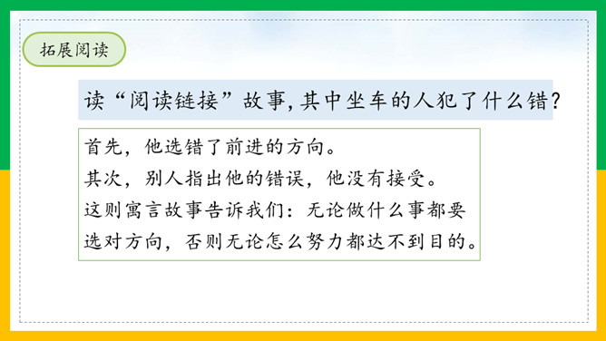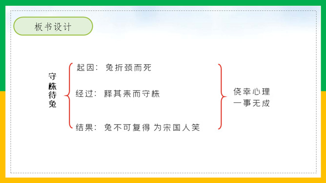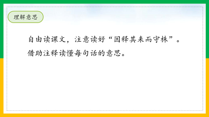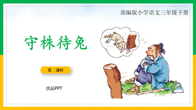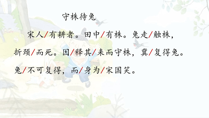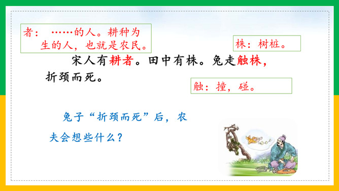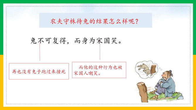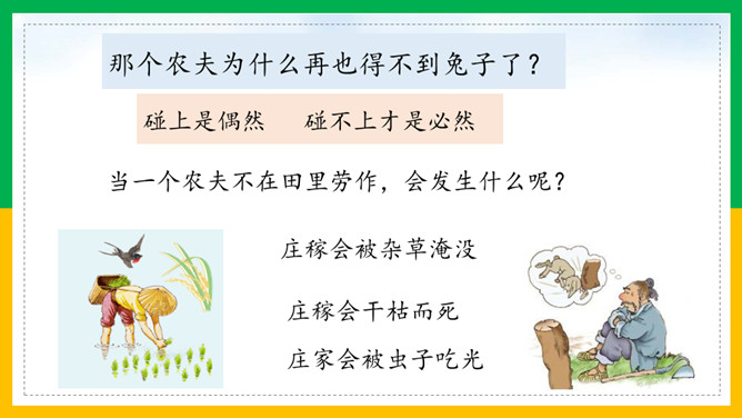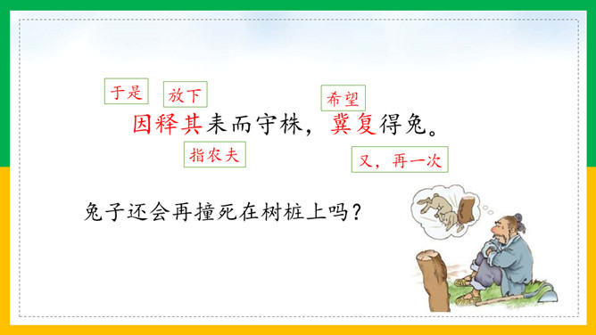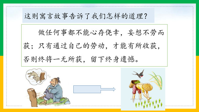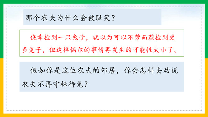 自由读课文,注意读好“因释其耒而守株”。借助注释读懂每句话的意思。那个农夫为什么会被耻笑?侥幸捡到一只兔子,就以为可以不劳而获捡到更多兔子,但这样偶尔的事情再发生的可能性太小了。假如你是这位农夫的邻居,你会怎样去劝说农夫不再守株待兔?这则寓言故事告诉了我们怎样的道理?做任何事都不能心存侥幸,妄想不劳而获;只有通过自己的劳动,才能有所收获,否则终将一无所获,留下终身遗憾。所属专题:守株待兔ppt。