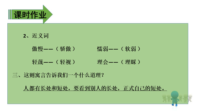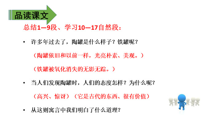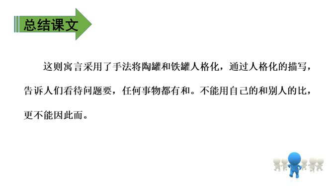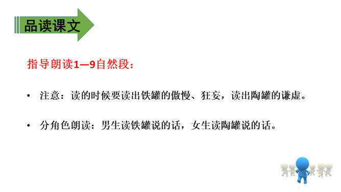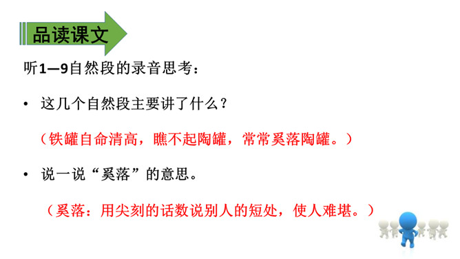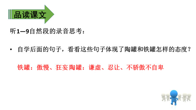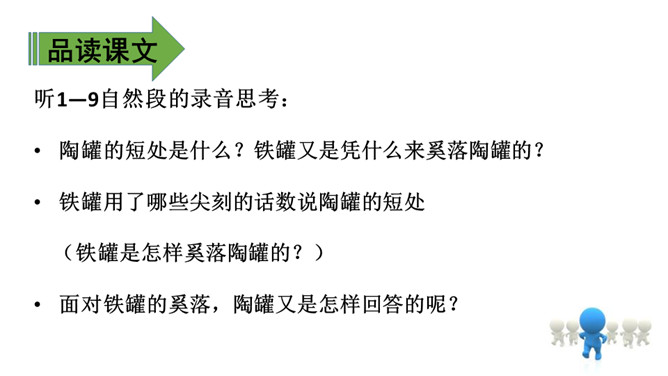 1.在朗读课文的基础上,理解课文内容。(重点)2.想象课文所描绘的画面,体会故事所蕴含的道理。(难点)开火车读课文,边听边思考:每一自然段讲的是什么?用简洁的话概括每一自然段的内容。听1—9自然段的录音思考:这几个自然段主要讲了什么?(铁罐自命清高,瞧不起陶罐,常常奚落陶罐。)说一说“奚落”的意思。(奚落:用尖刻的话数说别人的短处,使人难堪。)听1—9自然段的录音思考:陶罐的短处是什么?铁罐又是凭什么来奚落陶罐的?铁罐用了哪些尖刻的话数说陶罐的短处。所属专题:陶罐和铁罐ppt。