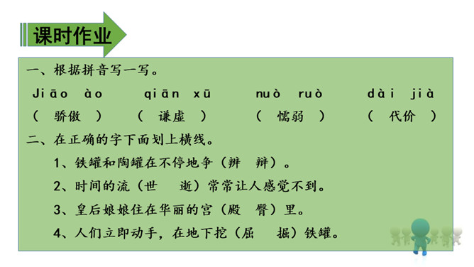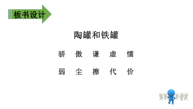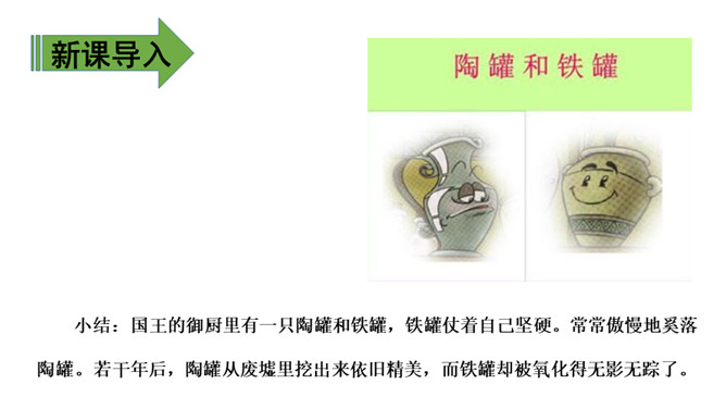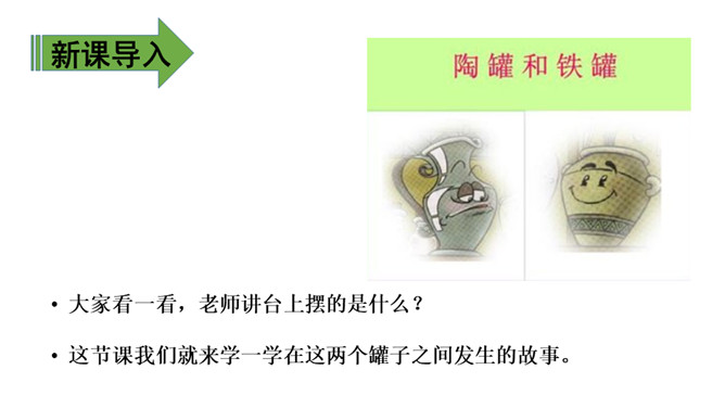 1.会认10个生字,会写11个生字。(重点)2.理解课文内容,了解寓言蕴含的道理。(难点)3.联系已学课文和生活经验加深对寓言的理解。(难点)4.分角色朗读课文。 (重点)1. 会认10个生字,会写11个生字。(重点)2. 正确、流利、有感情地朗读课文,理解课文内容。(重点)大家看一看,老师讲台上摆的是什么?这节课我们就来学一学在这两个罐子之间发生的故事。自由朗读课文,边读边画出自己最欣赏的句子。所属专题:陶罐和铁罐ppt。