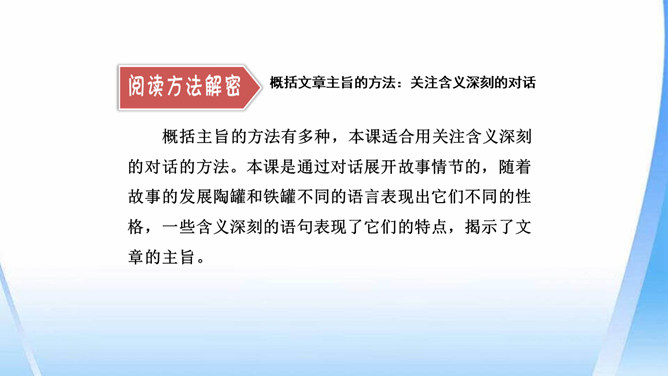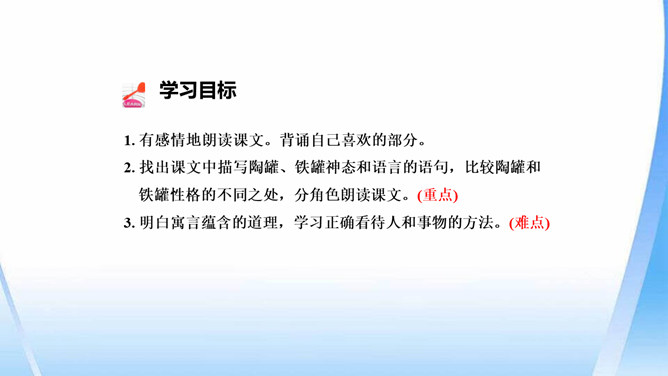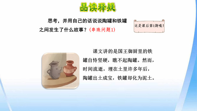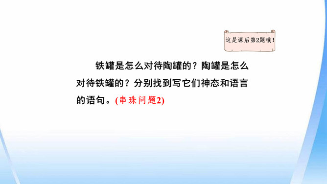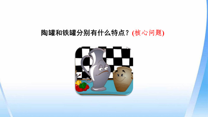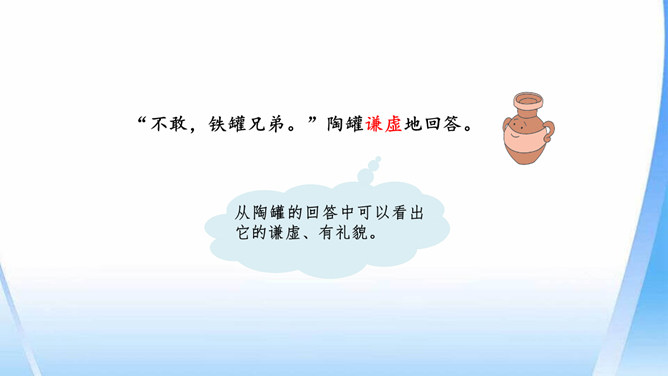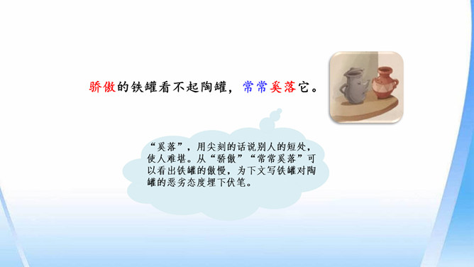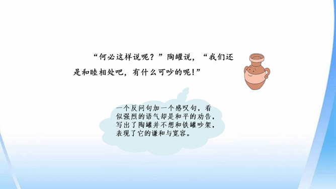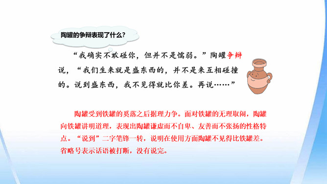 陶罐受到铁罐的奚落之后据理力争。面对铁罐的无理取闹,陶罐向铁罐讲明道理,表现出陶罐谦虚而不自卑、友善而不张扬的性格特点。“说到”二字笔锋一转,说明在使用方面陶罐不见得比铁罐差。省略号表示话语被打断,没有说完。因为陶罐的话句句在理,铁罐无以反驳,所以它恼羞成怒。“恼怒”一词形象地写出了铁罐的理屈词穷。通过描写铁罐生硬的语言,生动形象地刻画出它的蛮不讲理的形象。所属专题:陶罐和铁罐ppt。