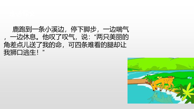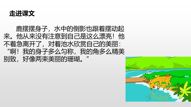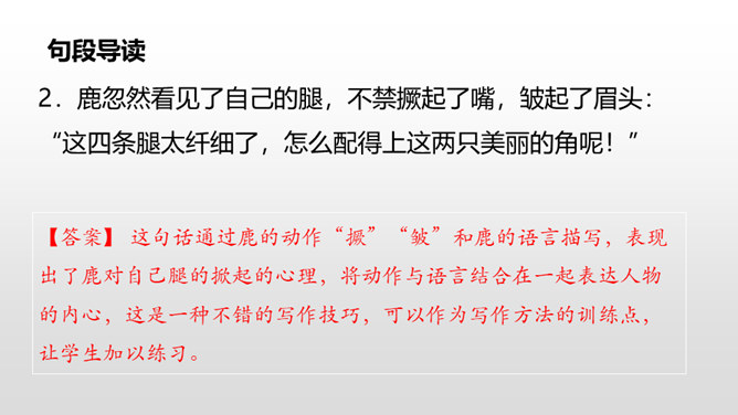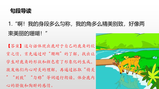 这句话体现出鹿对于自己的鹿角的欣赏之情,首先通过对“珊瑚”的了解,找出让学生对鹿角的形状和颜色有了形象化的生成,激发他们内心对美的理解,再通过抓取“精美”“别致”“匀称”等词进行朗读,体会鹿内心的骄傲和陶醉的感情。这句话通过鹿的动作“撅”“皱”和鹿的语言描写,表现出了鹿对自己腿的掀起的心理,将动作与语言结合在一起表达人物的内心,这是一种不错的写作技巧,可以作为写作方法的训练点,让学生加以练习。所属专题:美丽的鹿角ppt。