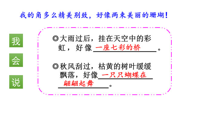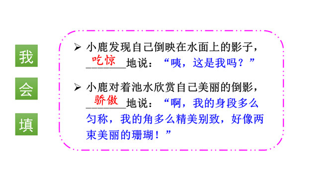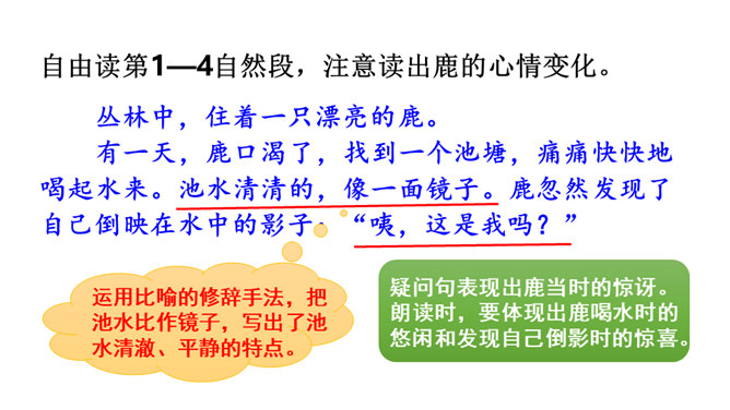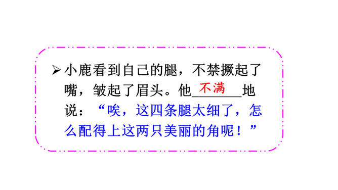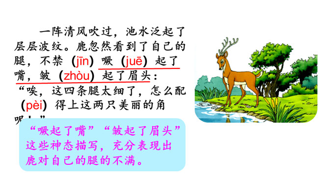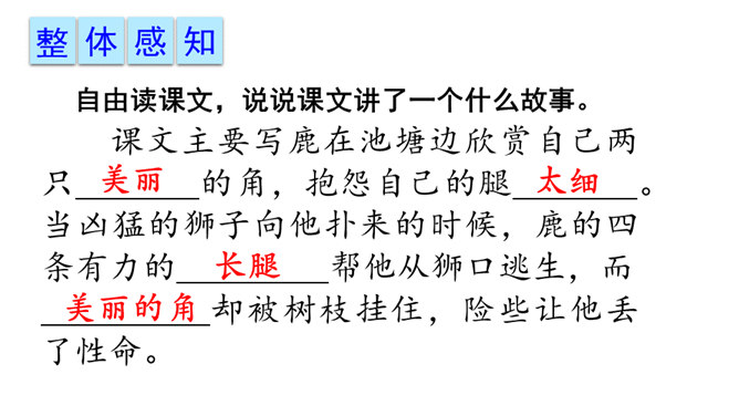 这篇课文讲的是在丛林中,一只拥有美丽的角和难看的细腿的鹿遇到狮子后靠细腿脱险的故事。这个故事告诉我们:事物各有所长,各有所短,不要只看它的长处而忽略它的短处,也不要因为它的短处而否定它的长处。还告诉我们,不要光图外表的美丽,更要讲实用;美丽和实用在不同的环境和条件下都有存在的价值。鹿在危险发生的前后对自己的腿和角的态度有什么不同?在危险发生前,鹿非常欣赏自己美丽的角,赞叹它精美别致。所属专题:美丽的鹿角ppt。所属专题:美丽的鹿角ppt。