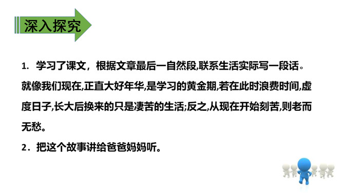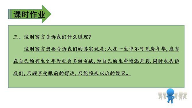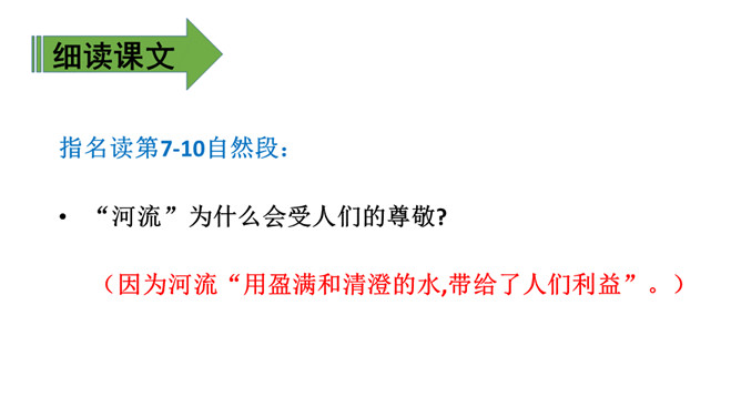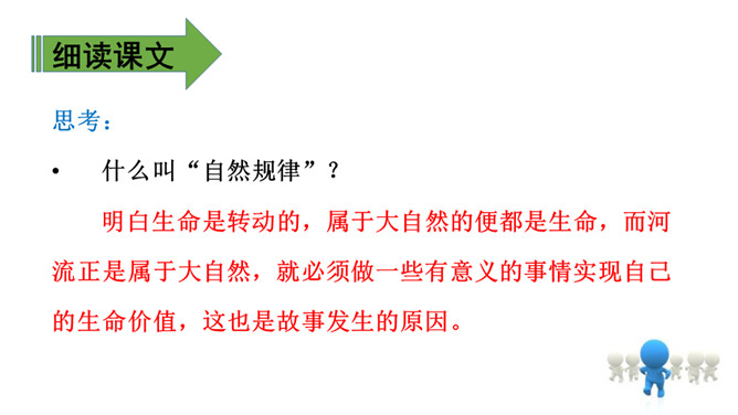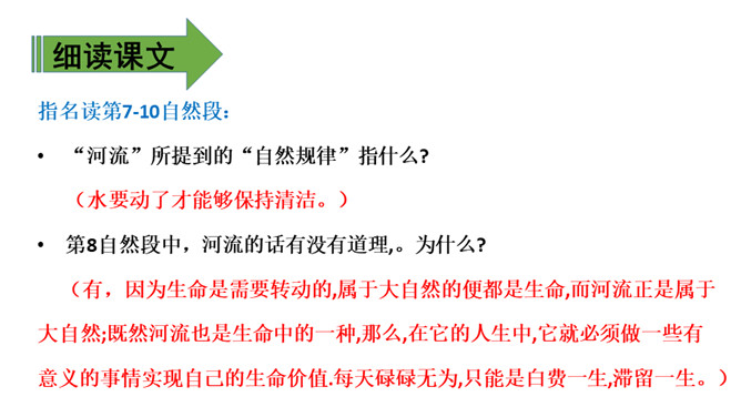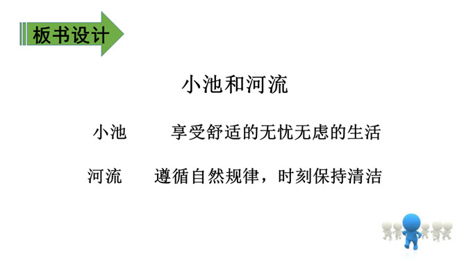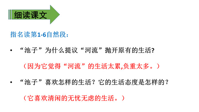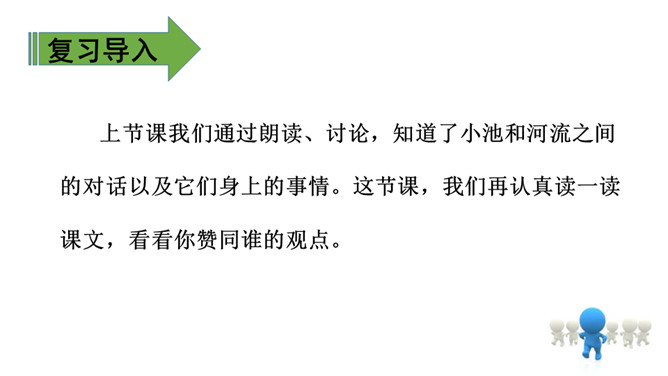 上节课我们通过朗读、讨论,知道了小池和河流之间的对话以及它们身上的事情。这节课,我们再认真读一读课文,看看你赞同谁的观点。 什么叫“自然规律”?明白生命是转动的,属于大自然的便都是生命,而河流正是属于大自然,就必须做一些有意义的事情实现自己的生命价值,这也是故事发生的原因。指名读第1-6自然段:“池子”为什么提议“河流”抛开原有的生活?(因为它觉得“河流”的生活太累,负重太多。)所属专题:池子与河流ppt。