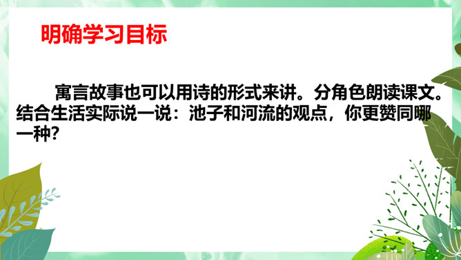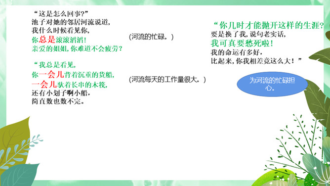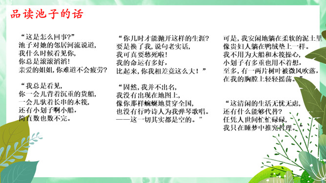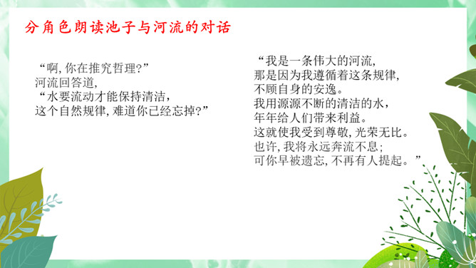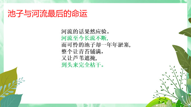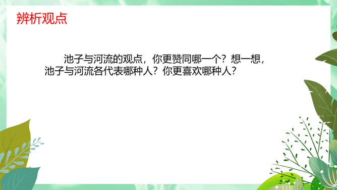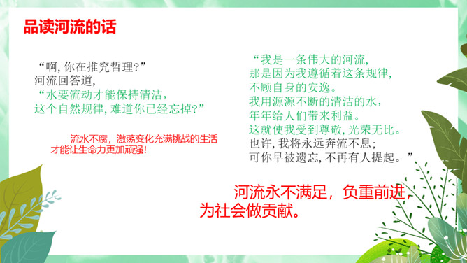 池子与河流的观点,你更赞同哪一个?想一想,池子与河流各代表哪种人?你更喜欢哪种人?你从这首诗中懂得了什么道理?生活与学习中,我们又该怎样做呢?才能不利用就会衰退,它会逐步磨灭;才能一旦让懒惰支配,它就一无所为。人的一生中不可荒废年华,应当在自己的有生之年为社会多做贡献,为自己的生命增添光彩。如果只顾眼前的舒适,只能换来以后的毁灭。所属专题:池子与河流ppt。