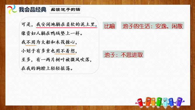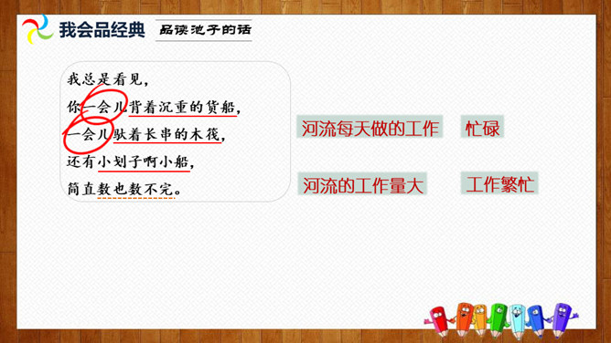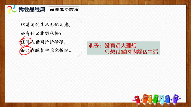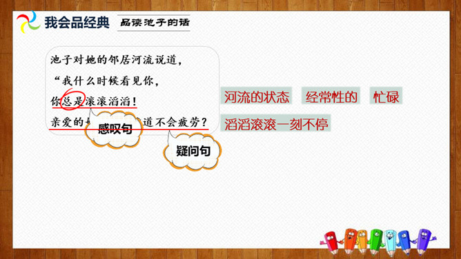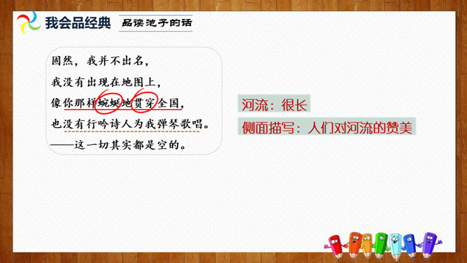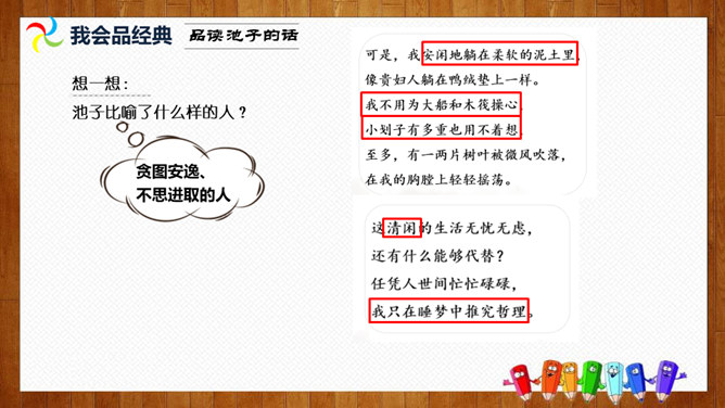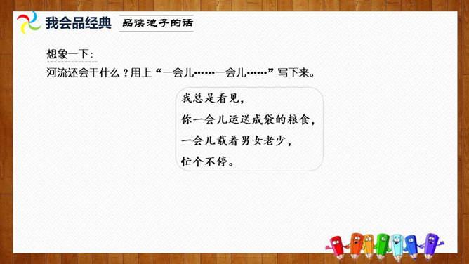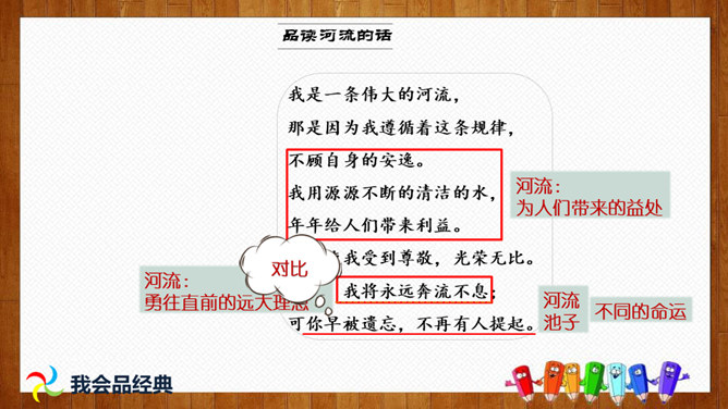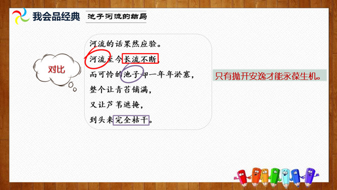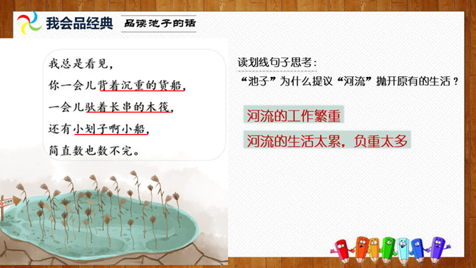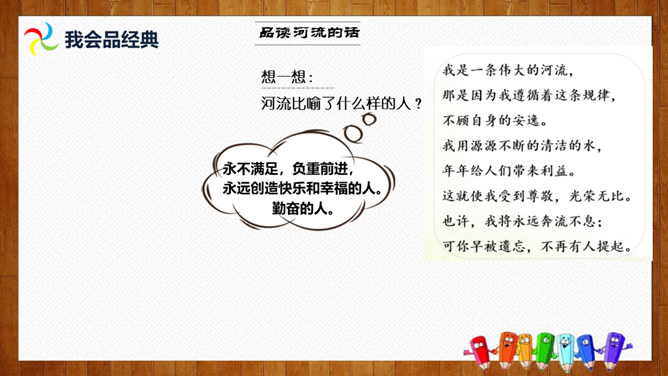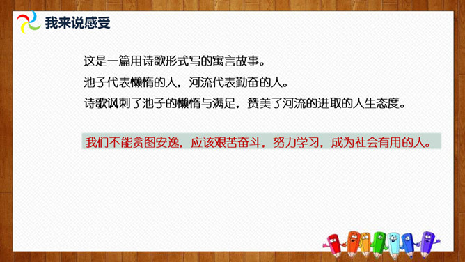 分角色朗读诗歌,理解诗歌的意思。结合生活实际说一说:池子与河流的观点,你更赞同哪一种?池子与河流各有什么特点?你更赞同哪一种?池子:追求安逸、不思进取。河流:奋斗不息、负重前行。这是一篇用诗歌形式写的寓言故事。池子代表懒惰的人,河流代表勤奋的人。诗歌讽刺了池子的懒惰与满足,赞美了河流的进取的人生态度。我们不能贪图安逸,应该艰苦奋斗,努力学习,成为社会有用的人。所属专题:池子与河流ppt。