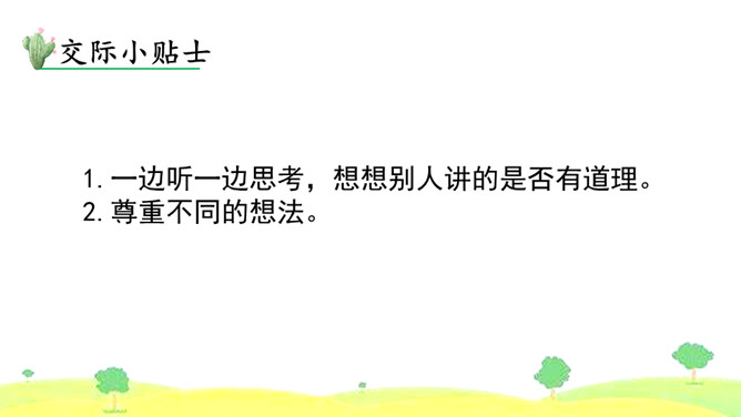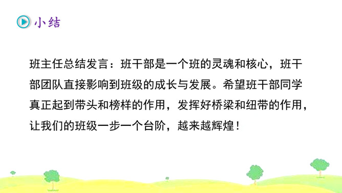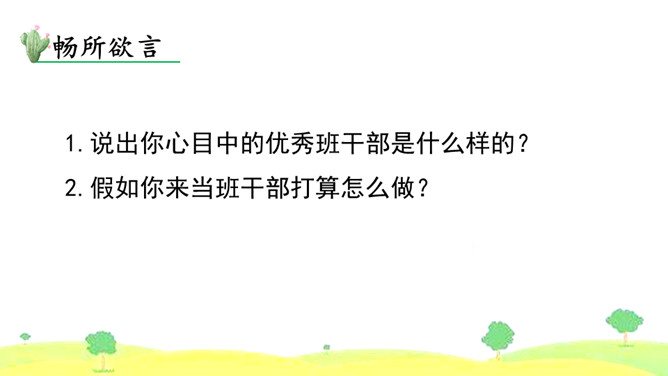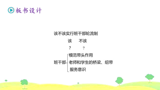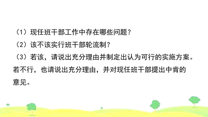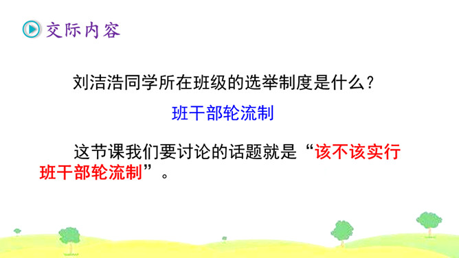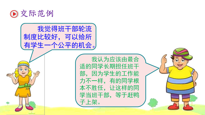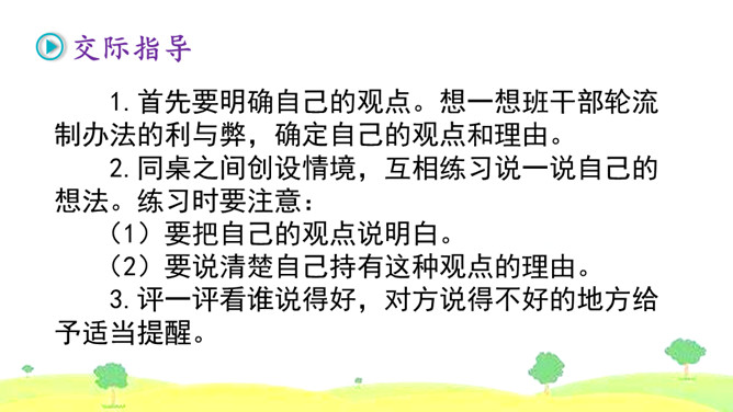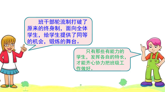 1.首先要明确自己的观点。想一想班干部轮流制办法的利与弊,确定自己的观点和理由。2.同桌之间创设情境,互相练习说一说自己的想法。练习时要注意:(1)要把自己的观点说明白。(2)要说清楚自己持有这种观点的理由。3.评一评看谁说得好,对方说得不好的地方给予适当提醒。我觉得班干部轮流制度比较好,可以给所有学生一个公平的机会。我认为应该由最合适的同学长期担任班干部,因为学生的工作能力不一样,有的同学根本不胜任,让这样的同学当班干部,等于赶鸭子上架。所属专题:该不该实行班干部轮流制ppt。