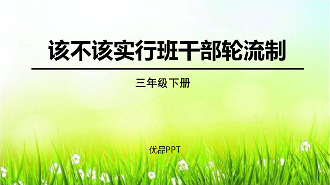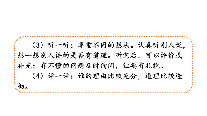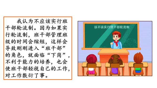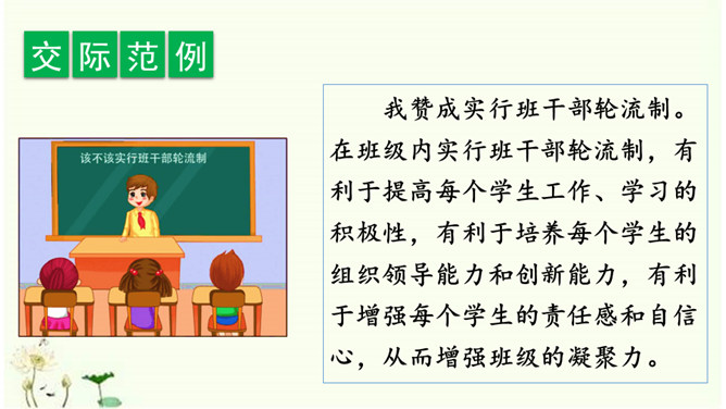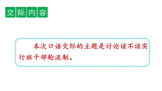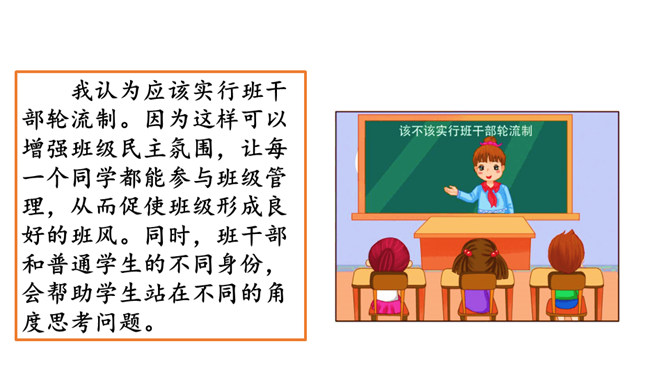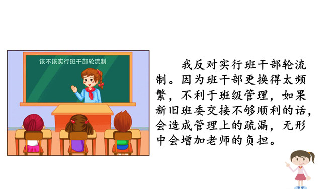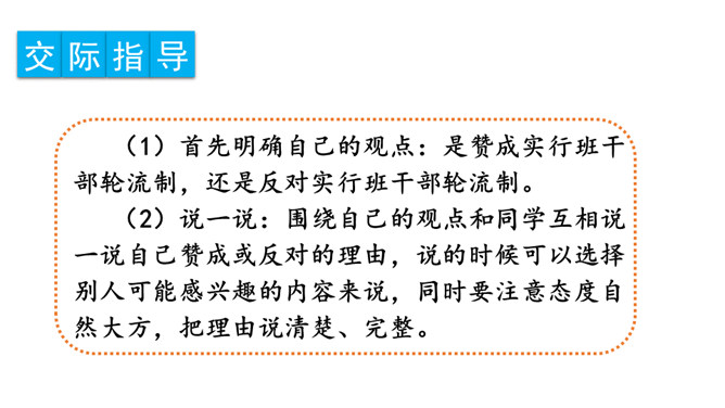 (1)首先明确自己的观点:是赞成实行班干部轮流制,还是反对实行班干部轮流制。(2)说一说:围绕自己的观点和同学互相说一说自己赞成或反对的理由,说的时候可以选择别人可能感兴趣的内容来说,同时要注意态度自然大方,把理由说清楚、完整。(3)听一听:尊重不同的想法。认真听别人说,想一想别人讲的是否有道理。听完后,可以评价或补充;有不懂的问题及时询问,但要有礼貌。(4)评一评:谁的理由比较充分,道理比较透彻。所属专题:该不该实行班干部轮流制ppt。