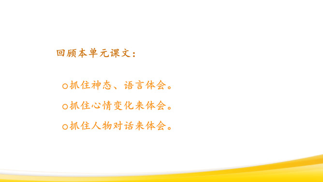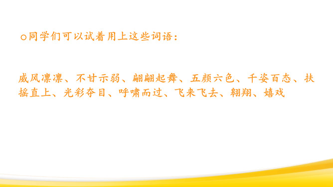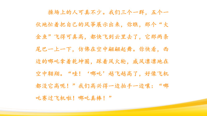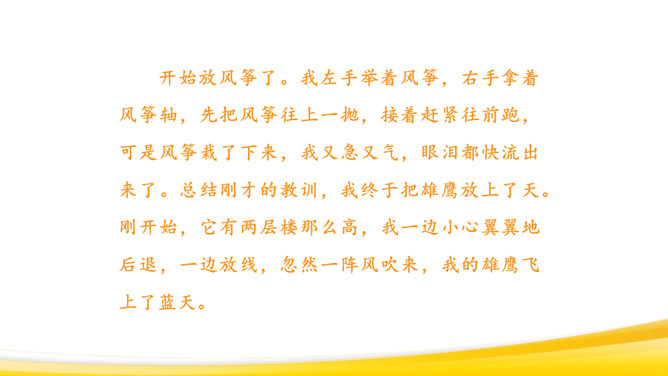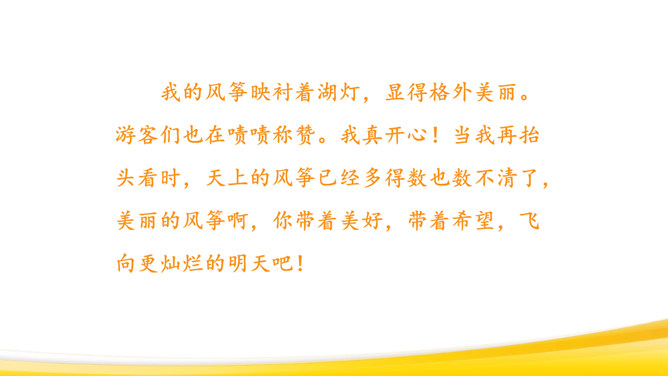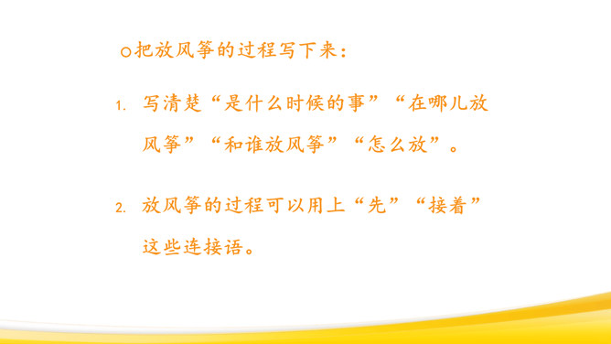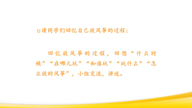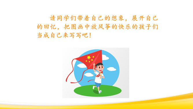 回顾本单元课文:抓住神态、语言体会。抓住心情变化来体会。抓住人物对话来体会。仔细观察图画,想一想:图画上有哪些人?在干什么?他们的动作是怎样的?可能说了哪些话?请同学们回忆自己放风筝的过程:回忆放风筝的过程,回想“什么时候”“在哪儿玩”“和谁玩”“玩什么”“怎么放的风筝”,小组交流,讲述。把放风筝的过程写下来:写清楚“是什么时候的事”“在哪儿放风筝”“和谁放风筝”“怎么放”。所属专题:看图画写作文ppt。