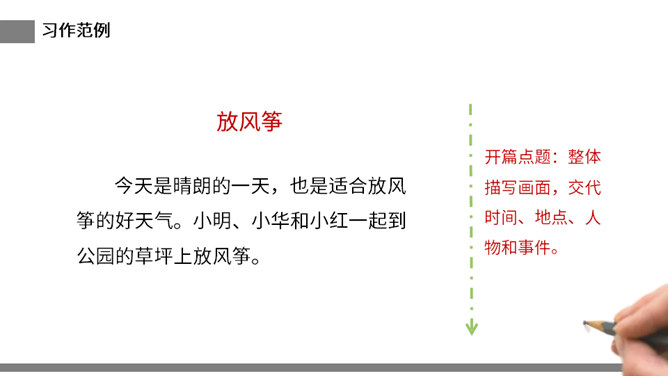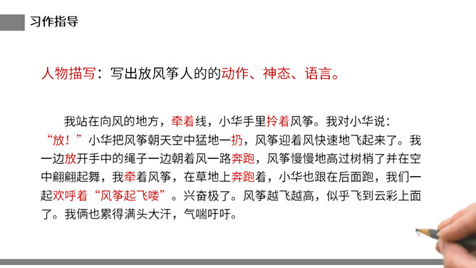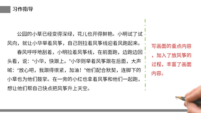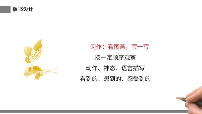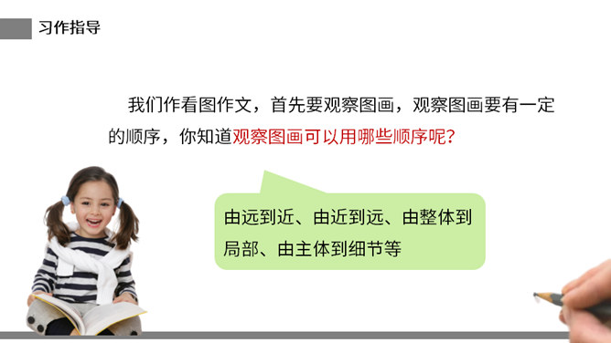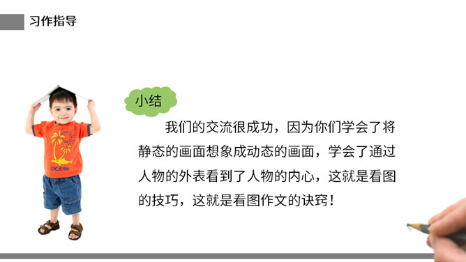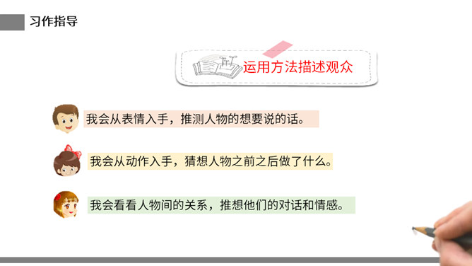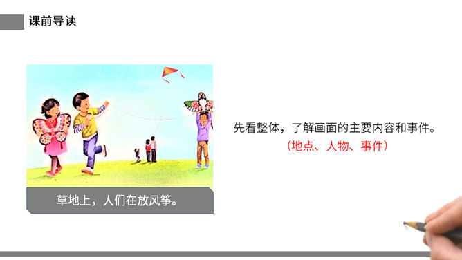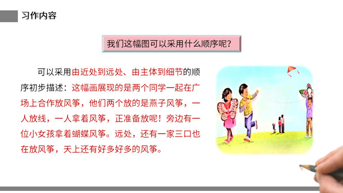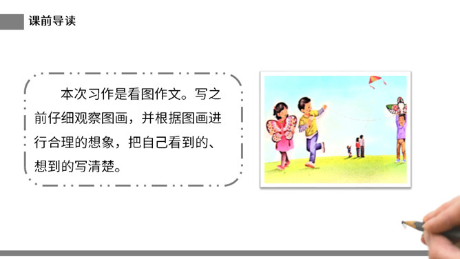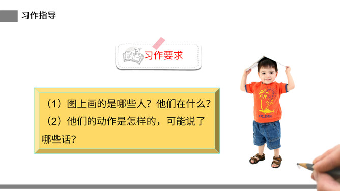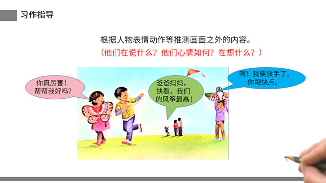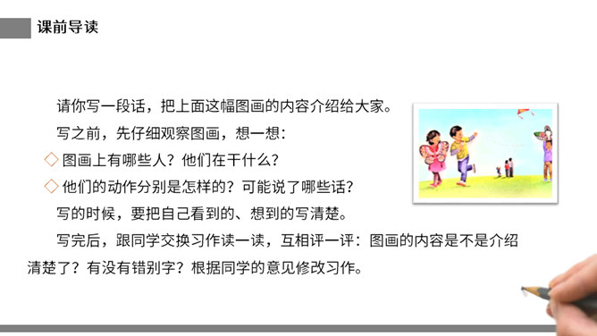 请你写一段话,把上面这幅图画的内容介绍给大家。写之前,先仔细观察图画,想一想:图画上有哪些人?他们在干什么?他们的动作分别是怎样的?可能说了哪些话?写的时候,要把自己看到的、想到的写清楚。写完后,跟同学交换习作读一读,互相评一评:图画的内容是不是介绍清楚了?有没有错别字?根据同学的意见修改习作。根据人物表情动作等推测画面之外的内容。(他们在说什么?他们心情如何?在想什么?)所属专题:看图画写作文ppt。
